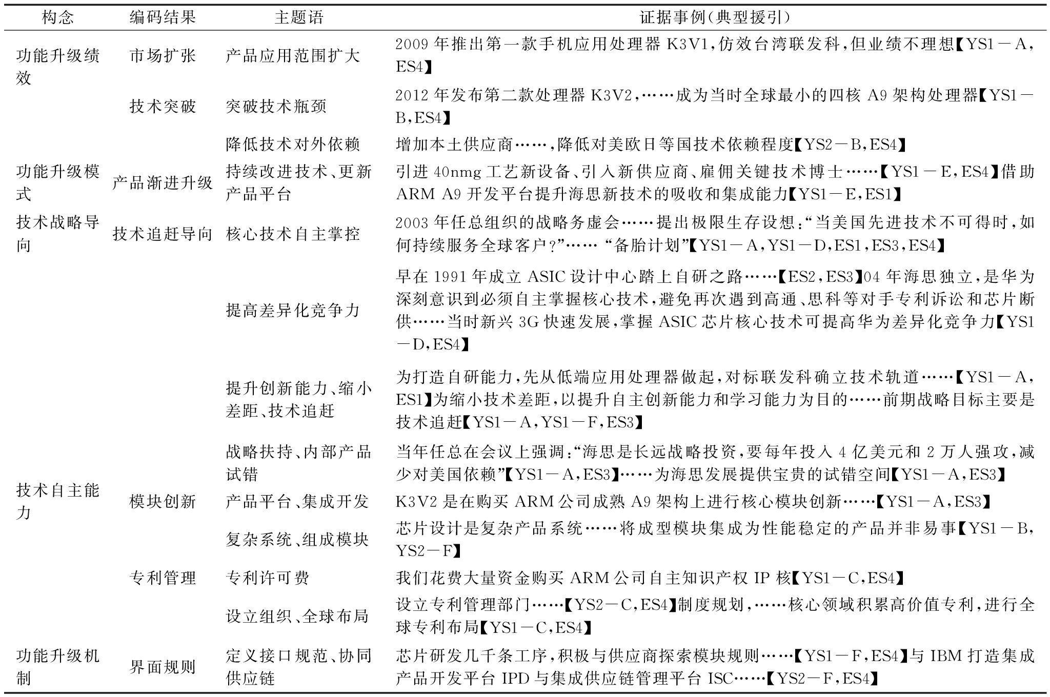 构念编码结果主题语证据事例(典型援引)功能升级绩效市场扩张产品应用范围扩大2009年推出第一款手机应用处理器K3V1,仿效台湾联发科,但业绩不理想【YS1-A,ES4】技术突破突破技术瓶颈2012年发布第二款处理器K3V2,……成为当时全球最小的四核A9架构处理器【YS1-B,ES4】降低技术对外依赖增加本土供应商……,降低对美欧日等国技术依赖程度【YS2-B,ES4】功能升级模式产品渐进升级持续改进技术、更新产品平台引进40nmg工艺新设备、引入新供应商、雇佣关键技术博士……【YS1-E,ES4】借助ARM A9开发平台提升海思新技术的吸收和集成能力【YS1-E,ES1】技术战略导向技术追赶导向核心技术自主掌控2003年任总组织的战略务虚会……提出极限生存设想:“当美国先进技术不可得时,如何持续服务全球客户?”…… “备胎计划”【YS1-A,YS1-D,ES1,ES3,ES4】提高差异化竞争力早在1991年成立ASIC设计中心踏上自研之路……【ES2,ES3】04年海思独立,是华为深刻意识到必须自主掌握核心技术,避免再次遇到高通、思科等对手专利诉讼和芯片断供……当时新兴3G快速发展,掌握ASIC芯片核心技术可提高华为差异化竞争力【YS1-D,ES4】提升创新能力、缩小差距、技术追赶为打造自研能力,先从低端应用处理器做起,对标联发科确立技术轨道……【YS1-A,ES1】为缩小技术差距,以提升自主创新能力和学习能力为目的……前期战略目标主要是技术追赶【YS1-A,YS1-F,ES3】战略扶持、内部产品试错当年任总在会议上强调:“海思是长远战略投资,要每年投入4亿美元和2万人强攻,减少对美国依赖”【YS1-A,ES3】……为海思发展提供宝贵的试错空间【YS1-A,ES3】技术自主能力模块创新产品平台、集成开发K3V2是在购买ARM公司成熟A9架构上进行核心模块创新……【YS1-A,ES3】复杂系统、组成模块芯片设计是复杂产品系统……将成型模块集成为性能稳定的产品并非易事【YS1-B,YS2-F】专利管理专利许可费我们花费大量资金购买ARM公司自主知识产权IP 核【YS1-C,ES4】设立组织、全球布局设立专利管理部门……【YS2-C,ES4】制度规划,……核心领域积累高价值专利,进行全球专利布局【YS1-C,ES4】功能升级机制界面规则定义接口规范、协同供应链芯片研发几千条工序,积极与供应商探索模块规则……【YS1-F,ES4】与IBM打造集成产品开发平台IPD与集成供应链管理平台ISC……【YS2-F,ES4】