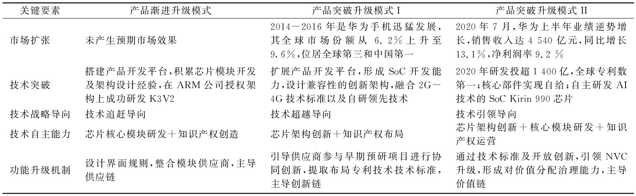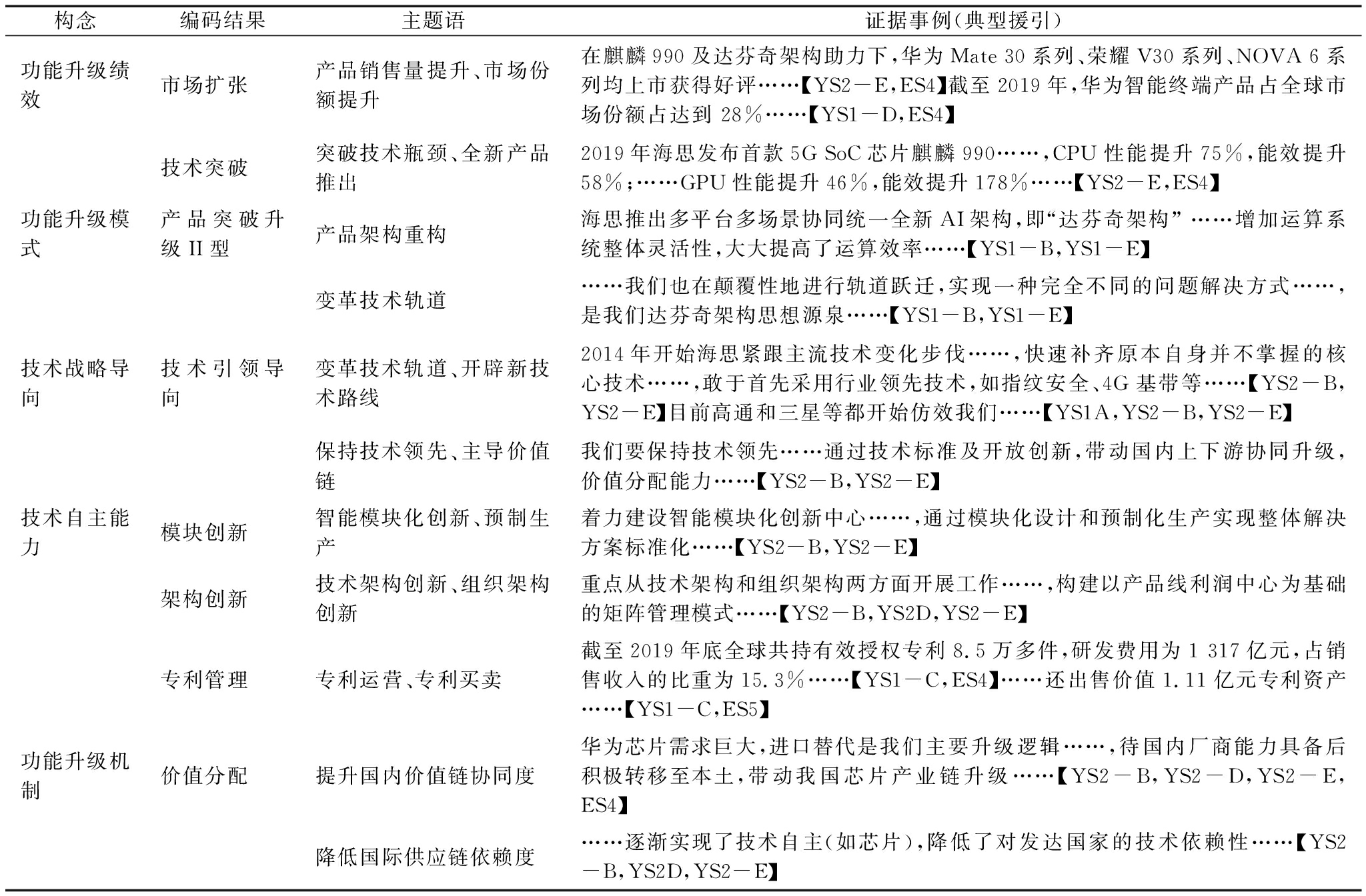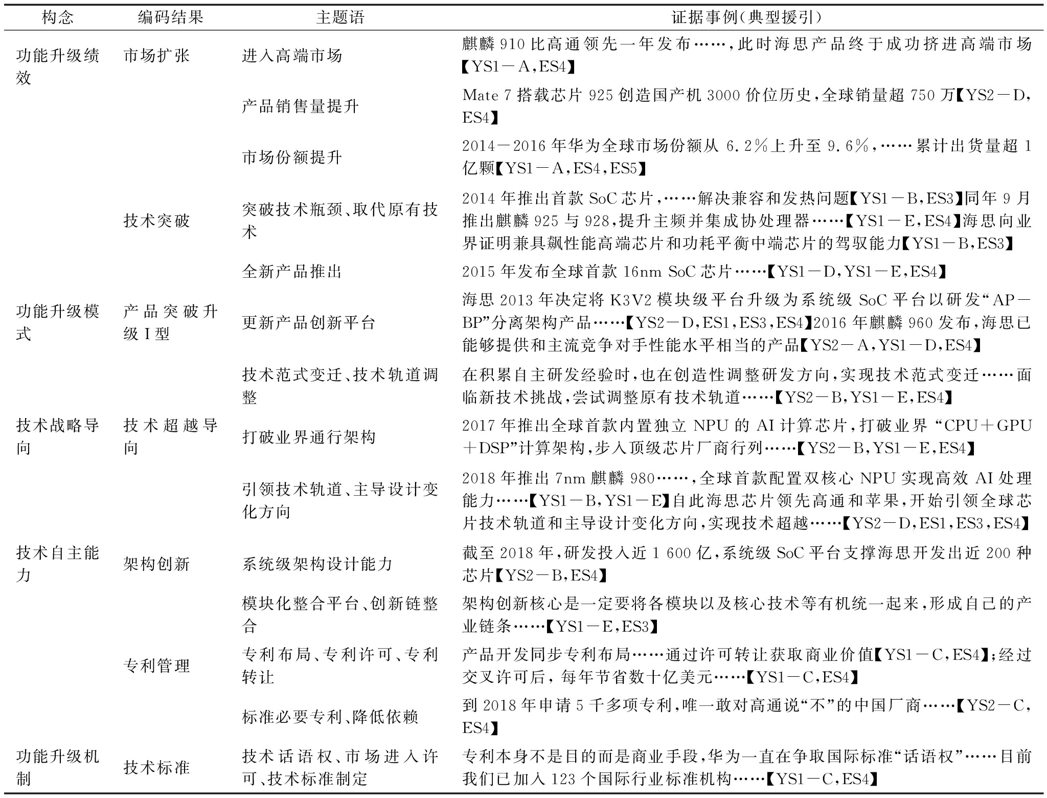 构念编码结果主题语证据事例(典型援引)功能升级绩效市场扩张进入高端市场麒麟910比高通领先一年发布……,此时海思产品终于成功挤进高端市场【YS1-A,ES4】产品销售量提升Mate 7搭载芯片925创造国产机3000价位历史,全球销量超750万【YS2-D,ES4】市场份额提升2014-2016年华为全球市场份额从 6.2%上升至9.6%,……累计出货量超1亿颗【YS1-A,ES4,ES5】技术突破突破技术瓶颈、取代原有技术2014年推出首款SoC芯片,……解决兼容和发热问题【YS1-B,ES3】同年9月推出麒麟925与928,提升主频并集成协处理器……【YS1-E,ES4】海思向业界证明兼具飙性能高端芯片和功耗平衡中端芯片的驾驭能力【YS1-B,ES3】全新产品推出2015年发布全球首款16nm SoC芯片……【YS1-D,YS1-E,ES4】功能升级模式产品突破升级I型更新产品创新平台海思2013年决定将K3V2模块级平台升级为系统级SoC平台以研发“AP-BP”分离架构产品……【YS2-D,ES1,ES3,ES4】2016年麒麟960发布,海思已能够提供和主流竞争对手性能水平相当的产品【YS2-A,YS1-D,ES4】技术范式变迁、技术轨道调整在积累自主研发经验时,也在创造性调整研发方向,实现技术范式变迁……面临新技术挑战,尝试调整原有技术轨道……【YS2-B,YS1-E,ES4】技术战略导向技术超越导向打破业界通行架构2017年推出全球首款内置独立NPU的AI计算芯片,打破业界 “CPU+GPU+DSP”计算架构,步入顶级芯片厂商行列……【YS2-B,YS1-E,ES4】引领技术轨道、主导设计变化方向2018年推出7nm麒麟980……,全球首款配置双核心NPU实现高效AI处理能力……【YS1-B,YS1-E】自此海思芯片领先高通和苹果,开始引领全球芯片技术轨道和主导设计变化方向,实现技术超越……【YS2-D,ES1,ES3,ES4】技术自主能力架构创新系统级架构设计能力截至2018年,研发投入近1 600亿,系统级SoC平台支撑海思开发出近200种芯片【YS2-B,ES4】模块化整合平台、创新链整合架构创新核心是一定要将各模块以及核心技术等有机统一起来,形成自己的产业链条……【YS1-E,ES3】专利管理专利布局、专利许可、专利转让产品开发同步专利布局……通过许可转让获取商业价值【YS1-C,ES4】;经过交叉许可后, 每年节省数十亿美元……【YS1-C,ES4】标准必要专利、降低依赖到2018年申请5千多项专利,唯一敢对高通说“不”的中国厂商……【YS2-C,ES4】功能升级机制技术标准技术话语权、市场进入许可、技术标准制定专利本身不是目的而是商业手段,华为一直在争取国际标准“话语权”……目前我们已加入123个国际行业标准机构……【YS1-C,ES4】