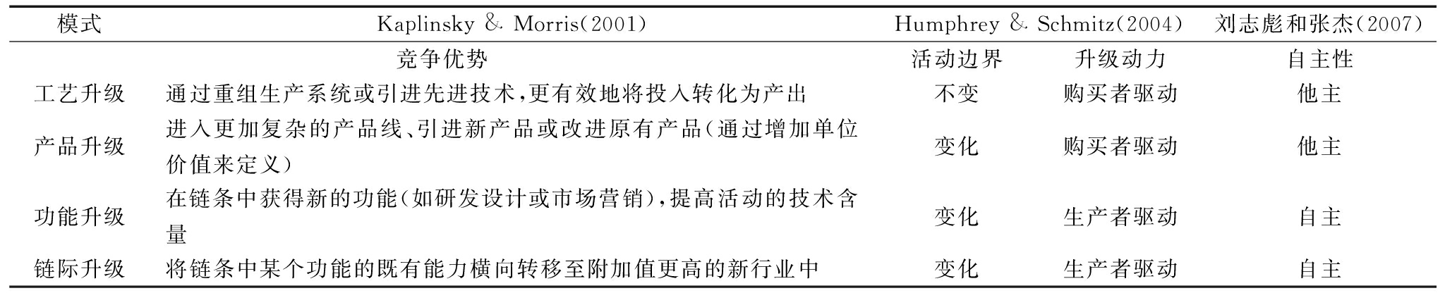 模式Kaplinsky & Morris(2001)Humphrey & Schmitz(2004)刘志彪和张杰(2007)竞争优势活动边界升级动力自主性工艺升级通过重组生产系统或引进先进技术,更有效地将投入转化为产出不变购买者驱动他主产品升级进入更加复杂的产品线、引进新产品或改进原有产品(通过增加单位价值来定义)变化购买者驱动他主功能升级在链条中获得新的功能(如研发设计或市场营销),提高活动的技术含量变化生产者驱动自主链际升级将链条中某个功能的既有能力横向转移至附加值更高的新行业中变化生产者驱动自主