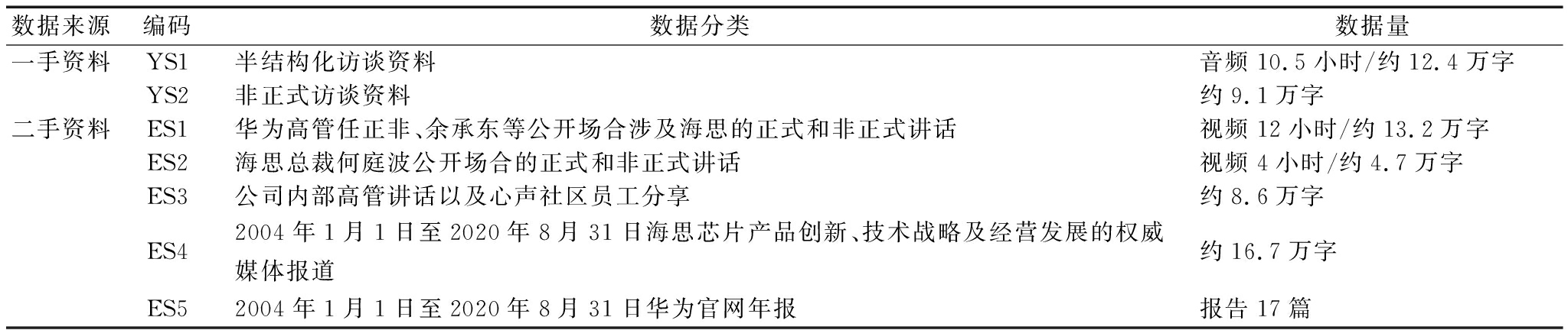 数据来源编码数据分类数据量一手资料YS1半结构化访谈资料音频10.5小时/约12.4万字YS2非正式访谈资料约9.1万字二手资料ES1华为高管任正非、余承东等公开场合涉及海思的正式和非正式讲话视频12小时/约13.2万字ES2海思总裁何庭波公开场合的正式和非正式讲话视频4小时/约4.7万字ES3公司内部高管讲话以及心声社区员工分享约8.6万字ES42004年1月1日至2020年8月31日海思芯片产品创新、技术战略及经营发展的权威媒体报道约16.7万字ES52004年1月1日至2020年8月31日华为官网年报报告17篇