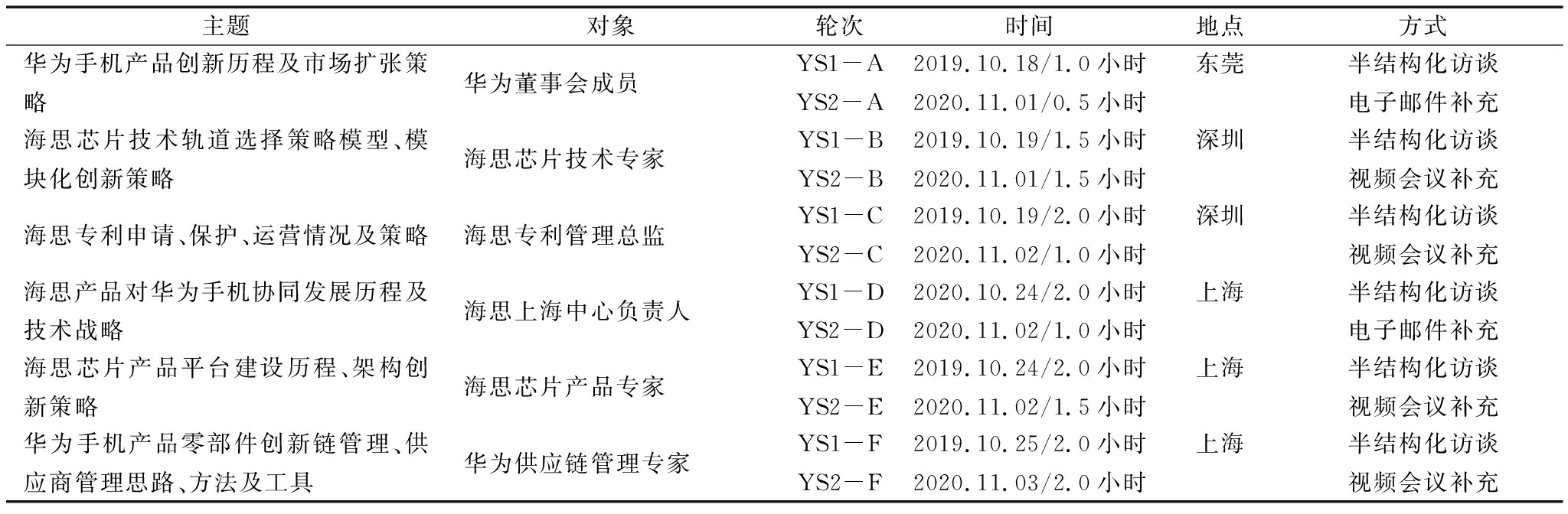 主题对象轮次时间地点方式华为手机产品创新历程及市场扩张策略华为董事会成员YS1-AYS2-A2019.10.18/1.0小时2020.11.01/0.5小时东莞半结构化访谈电子邮件补充海思芯片技术轨道选择策略模型、模块化创新策略海思芯片技术专家YS1-BYS2-B2019.10.19/1.5小时2020.11.01/1.5小时深圳半结构化访谈视频会议补充海思专利申请、保护、运营情况及策略海思专利管理总监YS1-CYS2-C2019.10.19/2.0小时2020.11.02/1.0小时深圳半结构化访谈视频会议补充海思产品对华为手机协同发展历程及技术战略海思上海中心负责人YS1-DYS2-D2020.10.24/2.0小时2020.11.02/1.0小时上海半结构化访谈电子邮件补充海思芯片产品平台建设历程、架构创新策略海思芯片产品专家YS1-EYS2-E2019.10.24/2.0小时2020.11.02/1.5小时上海半结构化访谈视频会议补充华为手机产品零部件创新链管理、供应商管理思路、方法及工具华为供应链管理专家YS1-FYS2-F2019.10.25/2.0小时2020.11.03/2.0小时上海半结构化访谈视频会议补充