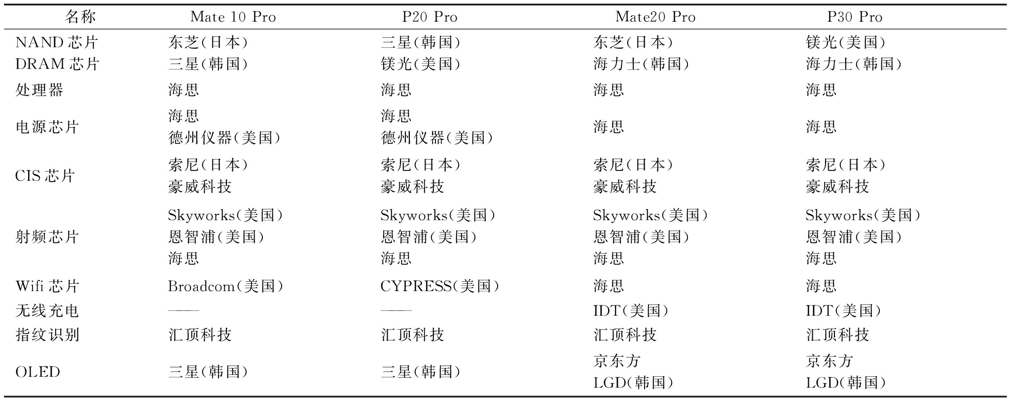 名称Mate 10 ProP20 ProMate20 ProP30 ProNAND芯片DRAM芯片东芝(日本)三星(韩国)三星(韩国)镁光(美国)东芝(日本)海力士(韩国)镁光(美国)海力士(韩国)处理器海思海思海思海思电源芯片海思德州仪器(美国)海思德州仪器(美国)海思海思CIS芯片索尼(日本)豪威科技索尼(日本)豪威科技索尼(日本)豪威科技索尼(日本)豪威科技射频芯片Skyworks(美国)恩智浦(美国)海思Skyworks(美国)恩智浦(美国)海思Skyworks(美国)恩智浦(美国)海思Skyworks(美国)恩智浦(美国)海思Wifi芯片Broadcom(美国)CYPRESS(美国)海思海思无线充电——————IDT(美国)IDT(美国)指纹识别汇顶科技汇顶科技汇顶科技汇顶科技OLED三星(韩国)三星(韩国)京东方LGD(韩国)京东方LGD(韩国)