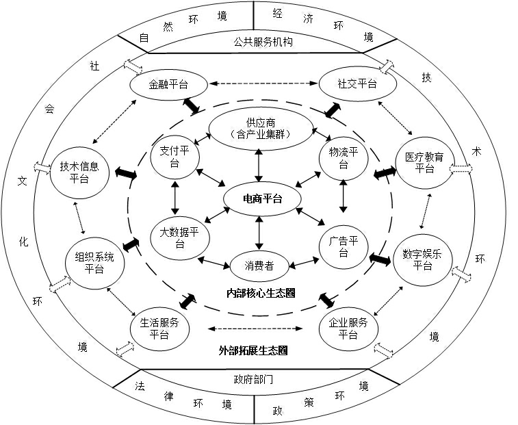 数字商务会演化为一个又一个协同网络,这些网络相互嵌合,促进网络不断衍生与扩张,进而使各相关方基于共创共享、协同演化,形成全新的商业生态系统。数字商务生态圈以用户需求为中心进行跨产业横向与纵向整合,形成平台和多元主体集合的协同网络。其中,电商生态圈是目前数字商务生态圈中最主要的组成部分,往往以电商平台方为核心主体,以网络信息为发展纽带,通过“并联”多类共生资源、产品和企业,并基于数字技术,促进各要素主体协作分工与优势互补,实现某种复杂性融合,从而不断深耕消费者潜在需求,增加用户黏性。其中,平台方提供的匹配与共享服务,可以极大提升整个网络的协同效应,推动生态整体发展[20]。