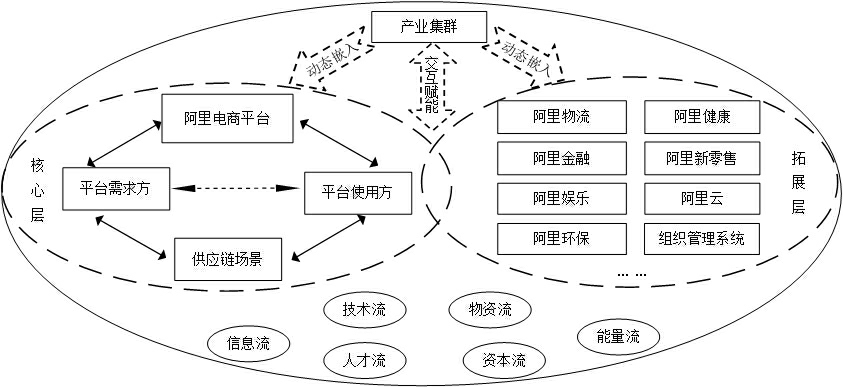 以阿里巴巴为例,其电商平台快速发展促进了物流、金融、信息等要素的优化配置,进而通过注资、收购和协同发展,使各要素创新演化为产业创新,由此构建以全渠道零售服务为核心业务,以支付与金融服务、信息技术服务、数字营销服务为支撑的良性互动与有机协同数字经济生态链体系,形成阿里零售、阿里金融、阿里物流、阿里娱乐、阿里环保、阿里健康等30多个业务板块跨界融合的全业态式数字商务生态圈,其生态模式如图2所示。类似的数字商务生态圈正不断涌现,意味着会有越来越多开放的社会化协同网络形成与演化。