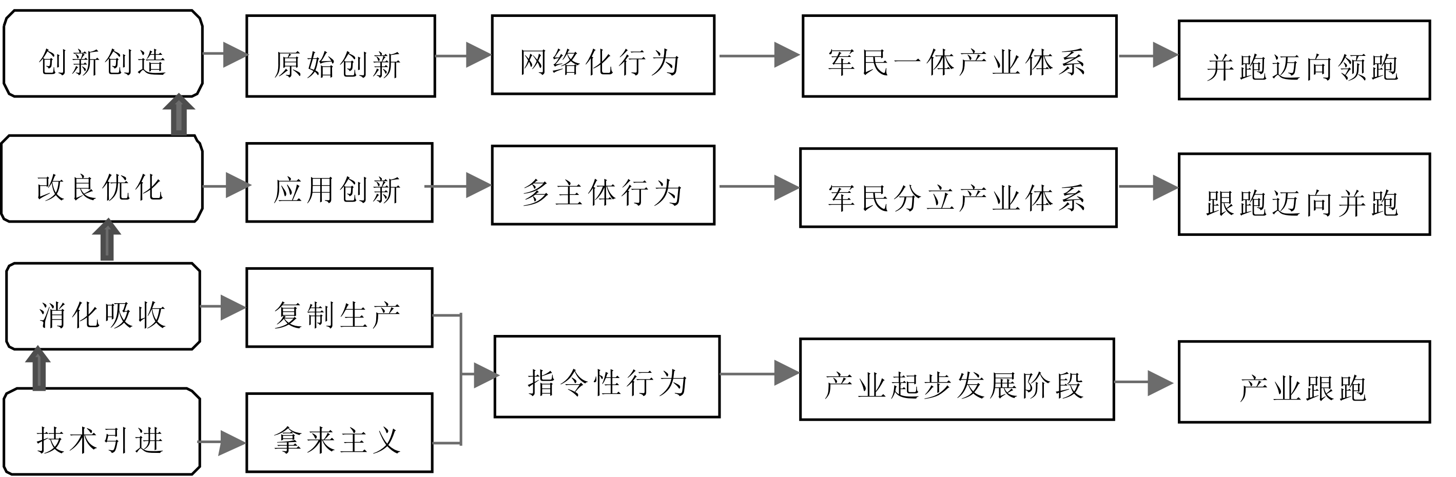 这一时期,面对急剧变化的军民需求,市场主体大多选择对原有技术进行改良和优化,开展应用型创新,市场主体之间的业务往来日趋紧密,产业链、供应链、创新链更加完善,这一过程主要是市场条件下企业的自发行为,且形成了门类齐全、产业链完整的军民两大科技工业体系,为我国市场经济发展、国防和军队建设打下了坚实的产业基础。当前,科技革命和产业革命浪潮席卷全球,科技创新以前所未有的速度推动产业发展,特别是由原始创新引领的技术进步成为产业发展的动力源泉,迅速且深刻地改变着国家经济结构、人民生活方式和军队战斗力生成模式。在这一阶段,应牢牢把握新一轮技术变革的历史机遇,大力加强基础研究和原始创新,提升自主创新能力,推动我国由应用创新大国向原始创新强国迈进[20],从主要依赖物质要素投入驱动产业发展转向主要依靠科技创新培育形成新比较优势,实现价值链升级重构,换挡超车,稳步推进我国产业现代化进程。