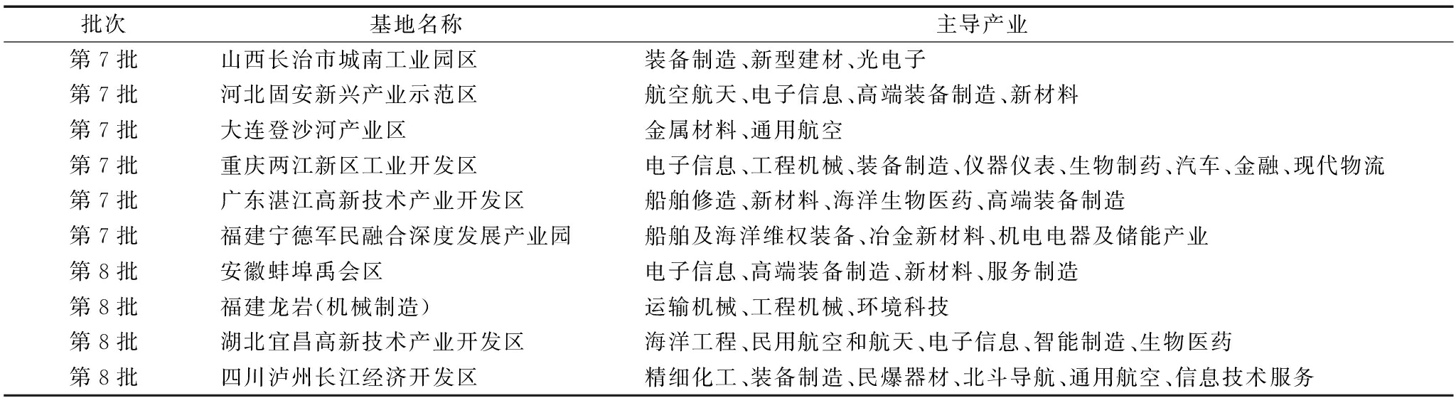 批次基地名称主导产业 第7批山西长治市城南工业园区装备制造、新型建材、光电子第7批河北固安新兴产业示范区航空航天、电子信息、高端装备制造、新材料第7批大连登沙河产业区金属材料、通用航空第7批重庆两江新区工业开发区电子信息、工程机械、装备制造、仪器仪表、生物制药、汽车、金融、现代物流第7批广东湛江高新技术产业开发区船舶修造、新材料、海洋生物医药、高端装备制造第7批福建宁德军民融合深度发展产业园船舶及海洋维权装备、冶金新材料、机电电器及储能产业第8批安徽蚌埠禹会区电子信息、高端装备制造、新材料、服务制造第8批福建龙岩(机械制造)运输机械、工程机械、环境科技第8批湖北宜昌高新技术产业开发区海洋工程、民用航空和航天、电子信息、智能制造、生物医药第8批四川泸州长江经济开发区精细化工、装备制造、民爆器材、北斗导航、通用航空、信息技术服务
