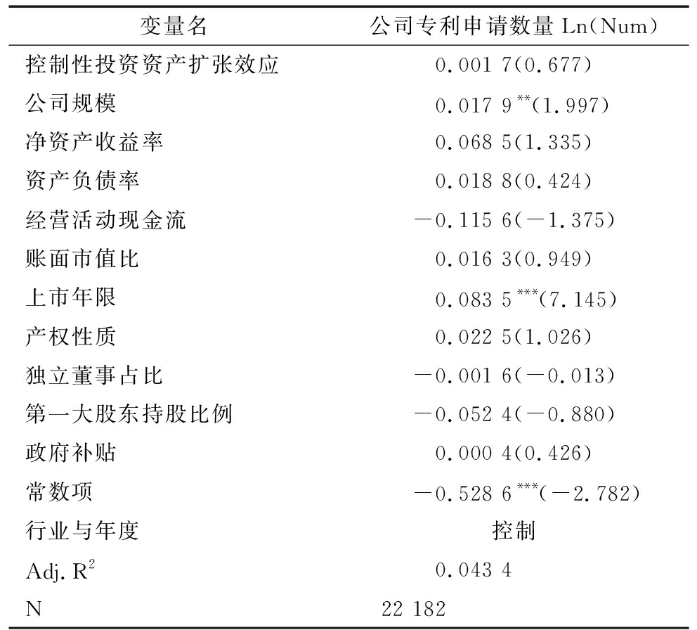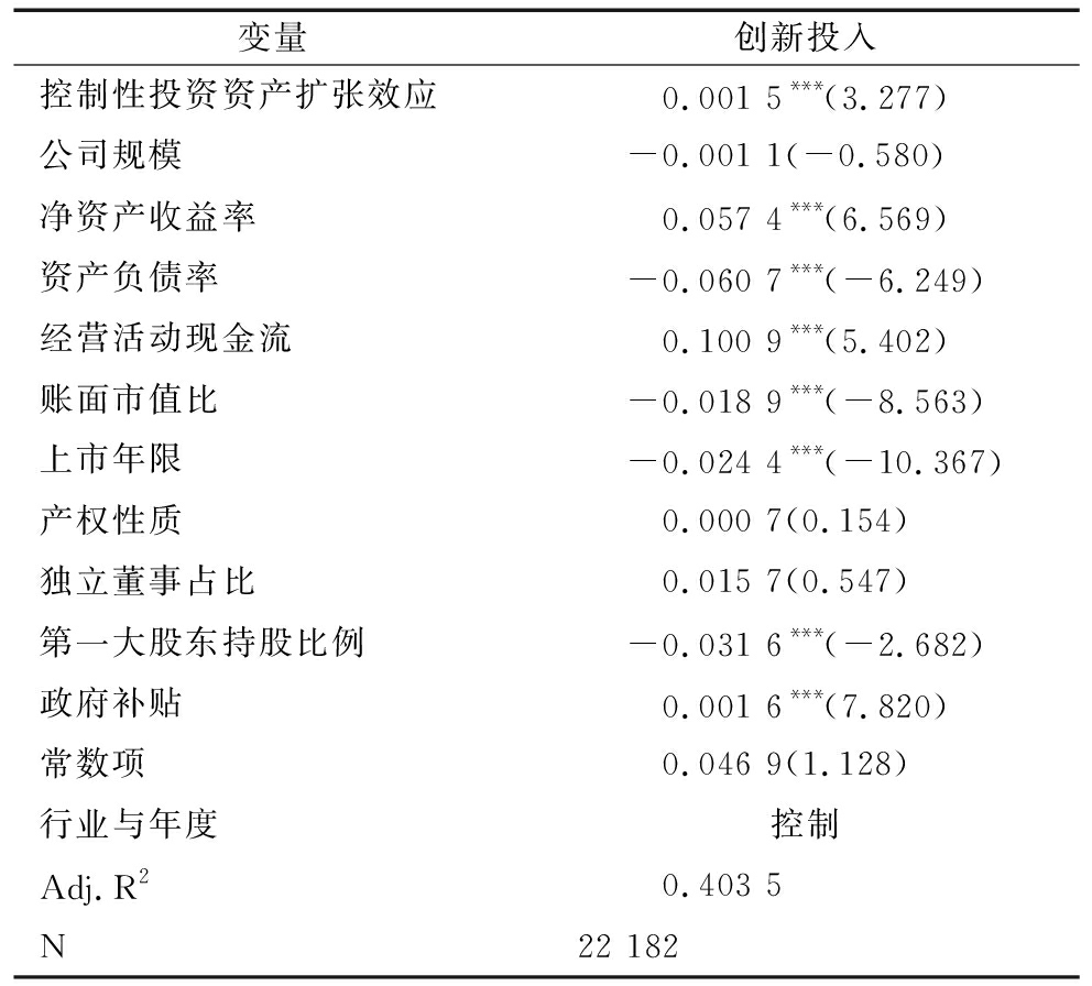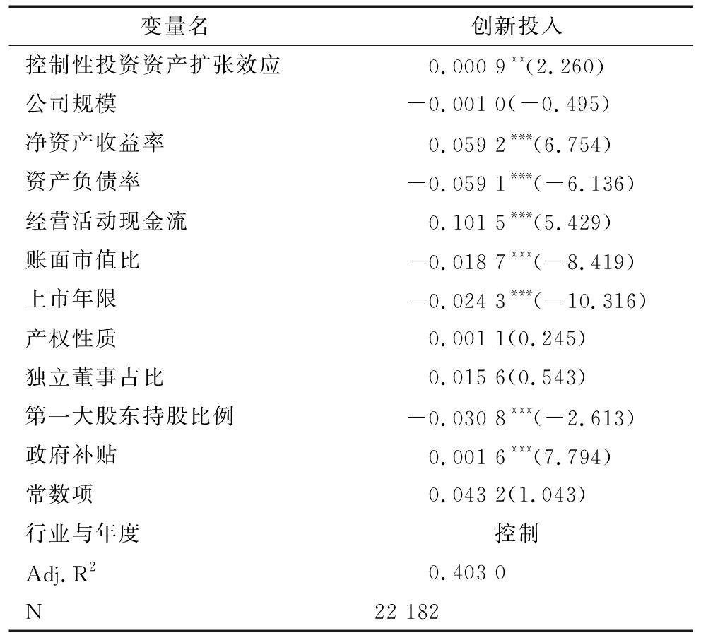 变量创新投入控制性投资资产扩张效应0.001 5***(3.277)公司规模-0.001 1(-0.580)净资产收益率0.057 4***(6.569)资产负债率-0.060 7***(-6.249)经营活动现金流0.100 9***(5.402)账面市值比-0.018 9***(-8.563)上市年限-0.024 4***(-10.367)产权性质0.000 7(0.154)独立董事占比0.015 7(0.547)第一大股东持股比例-0.031 6***(-2.682)政府补贴0.001 6***(7.820)常数项0.046 9(1.128)行业与年度控制Adj.R20.403 5N22 182