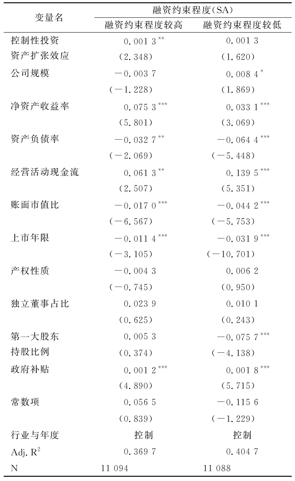 变量名融资约束程度(SA)融资约束程度较高融资约束程度较低控制性投资资产扩张效应0.001 3**0.001 3(2.348)(1.620)公司规模-0.003 70.008 4*(-1.228)(1.869)净资产收益率0.075 3***0.033 1***(5.801)(3.069)资产负债率-0.032 7**-0.064 4***(-2.069)(-5.448)经营活动现金流0.061 3**0.139 5***(2.507)(5.351)账面市值比-0.017 0***-0.044 2***(-6.567)(-5.753)上市年限-0.011 4***-0.031 9***(-3.105)(-10.701)产权性质-0.004 30.006 2(-0.745)(0.950)独立董事占比0.023 90.010 1(0.625)(0.243)第一大股东持股比例0.005 3-0.075 7***(0.374)(-4.138)政府补贴0.001 2***0.001 8***(4.890)(5.715)常数项0.056 5-0.115 6(0.839)(-1.229)行业与年度控制控制Adj.R20.369 70.404 7N11 09411 088