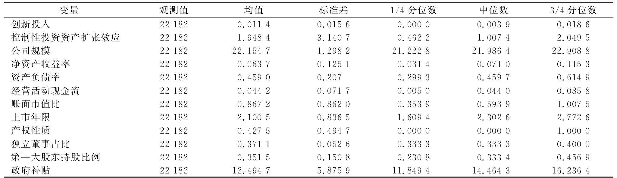 变量观测值均值标准差1/4分位数中位数3/4分位数创新投入22 1820.011 40.015 60.000 00.003 90.018 6控制性投资资产扩张效应22 1821.948 43.140 70.462 21.007 42.049 5公司规模22 18222.154 71.298 221.222 821.986 422.908 8净资产收益率22 1820.063 70.125 10.031 40.071 00.115 3资产负债率22 1820.459 00.207 0.299 30.459 70.614 9经营活动现金流22 1820.044 20.071 70.005 00.044 00.085 8账面市值比22 1820.867 20.862 00.353 90.593 91.007 5上市年限22 1822.100 50.836 51.609 42.302 62.772 6产权性质22 1820.427 50.494 70.000 00.000 01.000 0独立董事占比22 1820.371 10.052 60.333 30.333 30.400 0第一大股东持股比例22 1820.351 50.150 80.230 80.333 40.456 9政府补贴22 18212.494 75.875 911.849 414.464 316.236 4