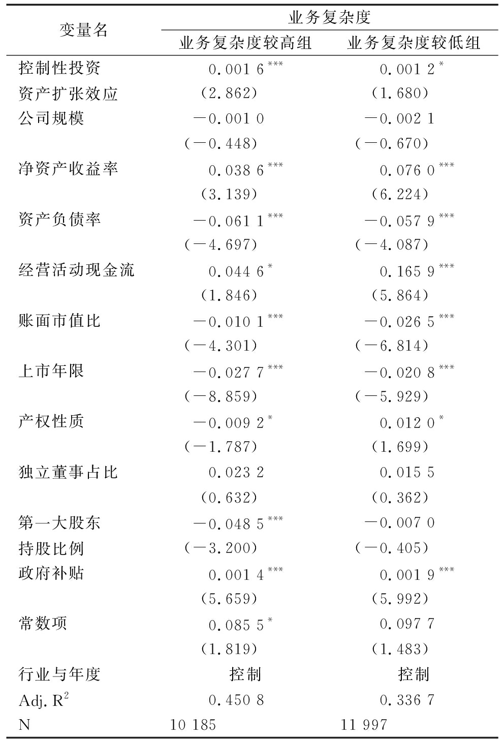变量名业务复杂度业务复杂度较高组业务复杂度较低组控制性投资资产扩张效应0.001 6***0.001 2*(2.862)(1.680)公司规模-0.001 0-0.002 1(-0.448)(-0.670)净资产收益率0.038 6***0.076 0***(3.139)(6.224)资产负债率-0.061 1***-0.057 9***(-4.697)(-4.087)经营活动现金流0.044 6*0.165 9***(1.846)(5.864)账面市值比-0.010 1***-0.026 5***(-4.301)(-6.814)上市年限-0.027 7***-0.020 8***(-8.859)(-5.929)产权性质-0.009 2*0.012 0*(-1.787)(1.699)独立董事占比0.023 20.015 5(0.632)(0.362)第一大股东持股比例-0.048 5***-0.007 0(-3.200)(-0.405)政府补贴0.001 4***0.001 9***(5.659)(5.992)常数项0.085 5*0.097 7(1.819)(1.483)行业与年度控制控制Adj.R20.450 80.336 7N10 18511 997