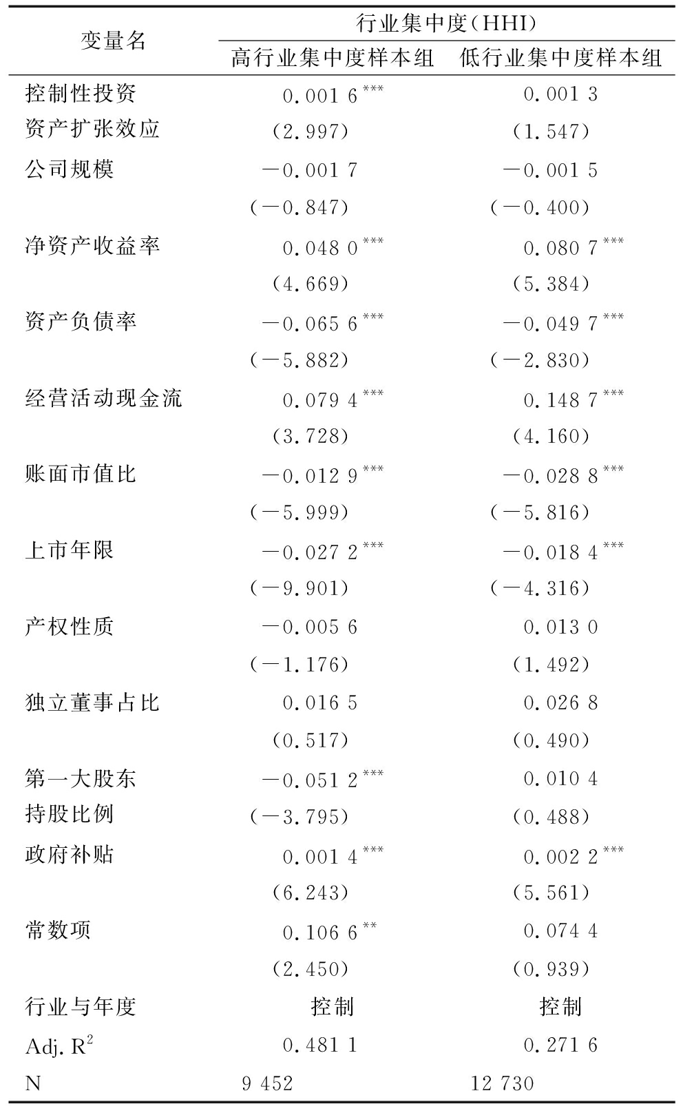 变量名行业集中度(HHI)高行业集中度样本组低行业集中度样本组控制性投资资产扩张效应0.001 6***0.001 3(2.997)(1.547)公司规模-0.001 7-0.001 5(-0.847)(-0.400)净资产收益率0.048 0***0.080 7***(4.669)(5.384)资产负债率-0.065 6***-0.049 7***(-5.882)(-2.830)经营活动现金流0.079 4***0.148 7***(3.728)(4.160)账面市值比-0.012 9***-0.028 8***(-5.999)(-5.816)上市年限-0.027 2***-0.018 4***(-9.901)(-4.316)产权性质-0.005 60.013 0(-1.176)(1.492)独立董事占比0.016 50.026 8(0.517)(0.490)第一大股东持股比例-0.051 2***0.010 4(-3.795)(0.488)政府补贴0.001 4***0.002 2***(6.243)(5.561)常数项0.106 6**0.074 4(2.450)(0.939)行业与年度控制控制Adj.R20.481 10.271 6N9 45212 730
