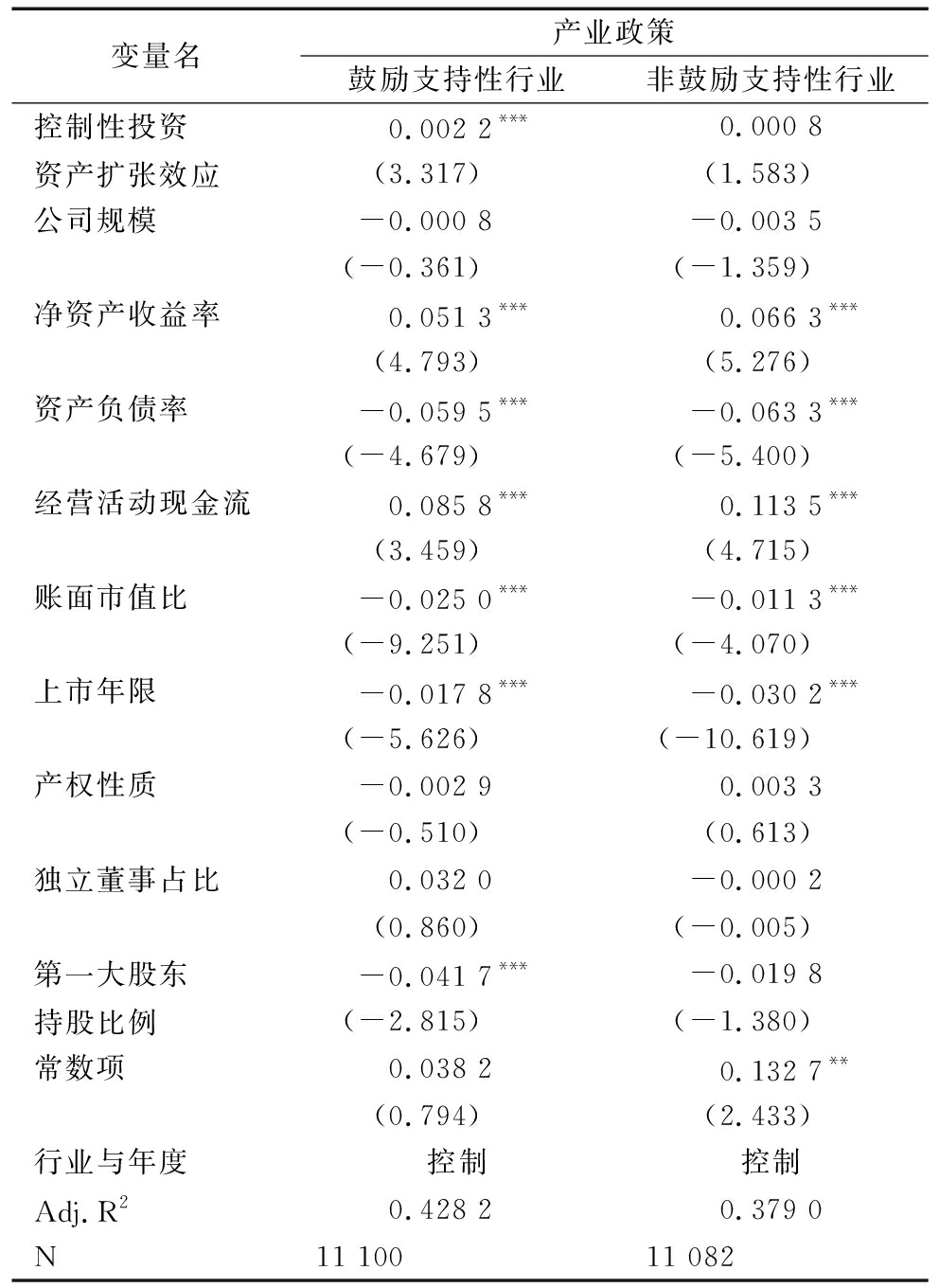 变量名产业政策鼓励支持性行业非鼓励支持性行业控制性投资资产扩张效应0.002 2***0.000 8(3.317)(1.583)公司规模-0.000 8-0.003 5(-0.361)(-1.359)净资产收益率0.051 3***0.066 3***(4.793)(5.276)资产负债率-0.059 5***-0.063 3***(-4.679)(-5.400)经营活动现金流0.085 8***0.113 5***(3.459)(4.715)账面市值比-0.025 0***-0.011 3***(-9.251)(-4.070)上市年限-0.017 8***-0.030 2***(-5.626)(-10.619)产权性质-0.002 90.003 3(-0.510)(0.613)独立董事占比0.032 0-0.000 2(0.860)(-0.005)第一大股东持股比例-0.041 7***-0.019 8(-2.815)(-1.380)常数项0.038 20.132 7**(0.794)(2.433)行业与年度控制控制Adj.R20.428 20.379 0N11 10011 082