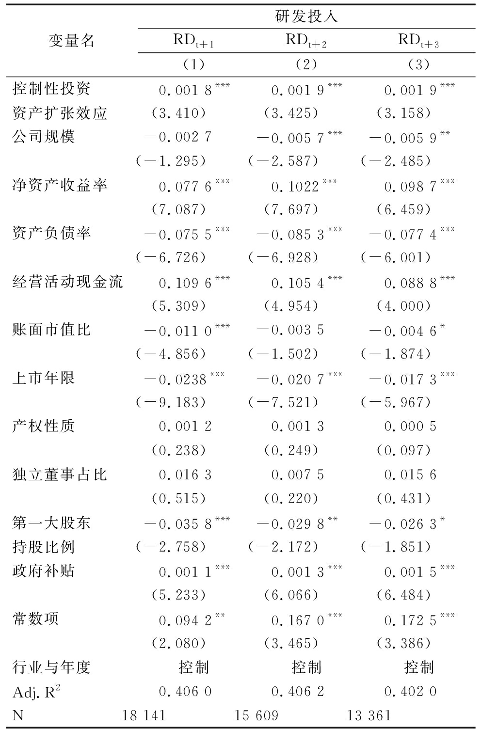 变量名研发投入RDt+1RDt+2RDt+3(1)(2)(3)控制性投资资产扩张效应0.001 8***0.001 9***0.001 9***(3.410)(3.425)(3.158)公司规模-0.002 7-0.005 7***-0.005 9**(-1.295)(-2.587)(-2.485)净资产收益率0.077 6***0.1022***0.098 7***(7.087)(7.697)(6.459)资产负债率-0.075 5***-0.085 3***-0.077 4***(-6.726)(-6.928)(-6.001)经营活动现金流0.109 6***0.105 4***0.088 8***(5.309)(4.954)(4.000)账面市值比-0.011 0***-0.003 5-0.004 6*(-4.856)(-1.502)(-1.874)上市年限-0.0238***-0.020 7***-0.017 3***(-9.183)(-7.521)(-5.967)产权性质0.001 20.001 30.000 5(0.238)(0.249)(0.097)独立董事占比0.016 30.007 50.015 6(0.515)(0.220)(0.431)第一大股东持股比例-0.035 8***-0.029 8**-0.026 3*(-2.758)(-2.172)(-1.851)政府补贴0.001 1***0.001 3***0.001 5***(5.233)(6.066)(6.484)常数项0.094 2**0.167 0***0.172 5***(2.080)(3.465)(3.386)行业与年度控制控制控制Adj.R20.406 00.406 20.402 0N18 14115 60913 361