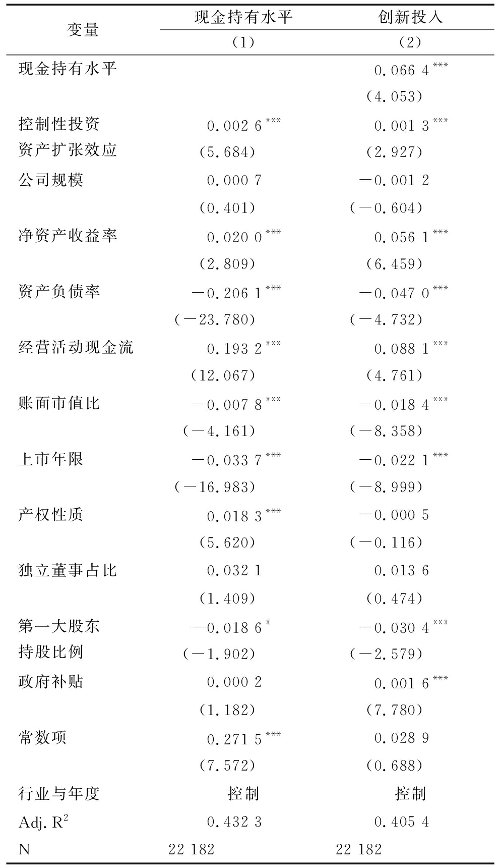 变量现金持有水平创新投入(1)(2)现金持有水平0.066 4***(4.053)控制性投资资产扩张效应0.002 6***0.001 3***(5.684)(2.927)公司规模0.000 7-0.001 2(0.401)(-0.604)净资产收益率0.020 0***0.056 1***(2.809)(6.459)资产负债率-0.206 1***-0.047 0***(-23.780)(-4.732)经营活动现金流0.193 2***0.088 1***(12.067)(4.761)账面市值比-0.007 8***-0.018 4***(-4.161)(-8.358)上市年限-0.033 7***-0.022 1***(-16.983)(-8.999)产权性质0.018 3***-0.000 5(5.620)(-0.116)独立董事占比0.032 10.013 6(1.409)(0.474)第一大股东持股比例-0.018 6*-0.030 4***(-1.902)(-2.579)政府补贴0.000 20.001 6***(1.182)(7.780)常数项0.271 5***0.028 9(7.572)(0.688)行业与年度控制控制Adj.R20.432 30.405 4N22 18222 182
