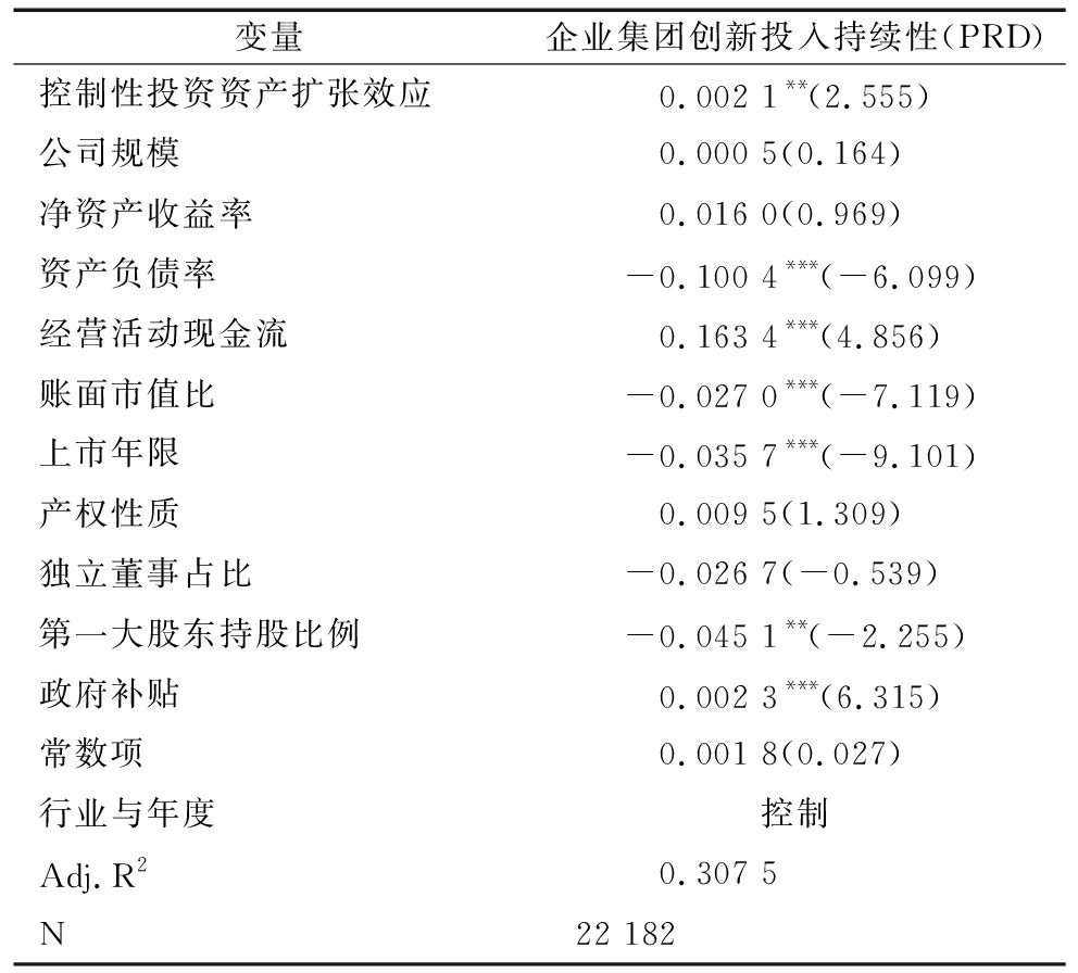 变量企业集团创新投入持续性(PRD)控制性投资资产扩张效应0.002 1**(2.555)公司规模0.000 5(0.164)净资产收益率0.016 0(0.969)资产负债率-0.100 4***(-6.099)经营活动现金流0.163 4***(4.856)账面市值比-0.027 0***(-7.119)上市年限-0.035 7***(-9.101)产权性质0.009 5(1.309)独立董事占比-0.026 7(-0.539)第一大股东持股比例-0.045 1**(-2.255)政府补贴0.002 3***(6.315)常数项0.001 8(0.027)行业与年度控制Adj.R20.307 5N22 182