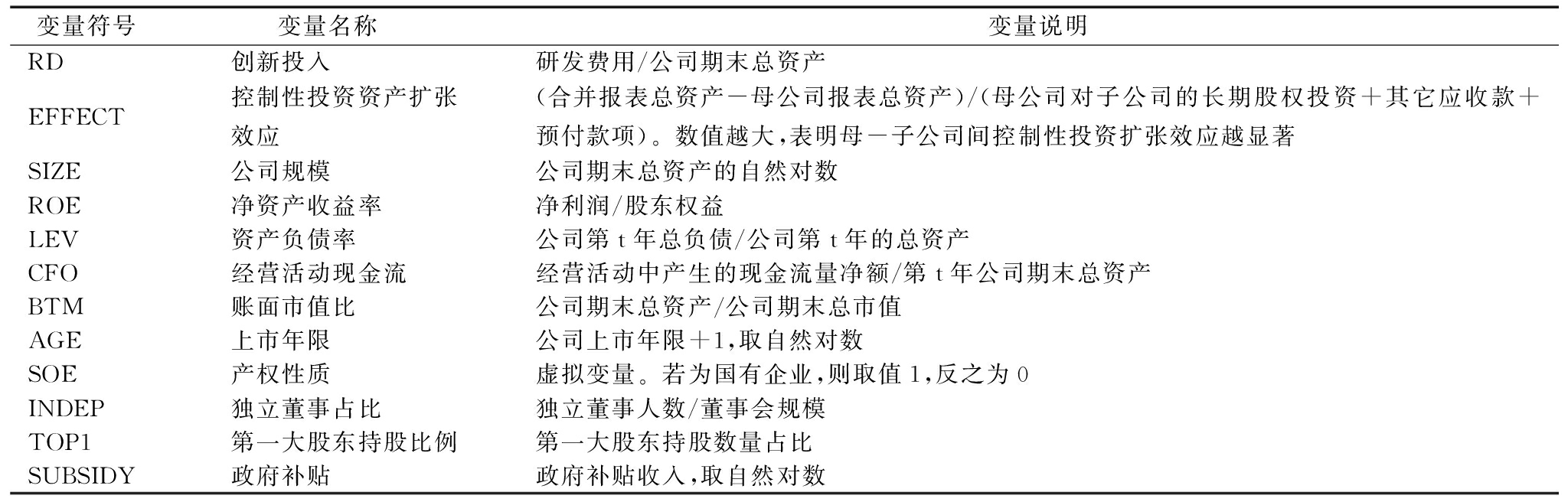 在模型(1)中,RD表示企业集团创新投入,EFFECT表示母-子公司控制性投资资产扩张效应。根据以往研究,本文除对上述公司财务变量与公司治理变量进行控制外,还对行业年度固定效应进行控制,行业分类标准为证监会发布的《上市公司行业分类指引》(2012年版)。主要变量定义如表1所示。