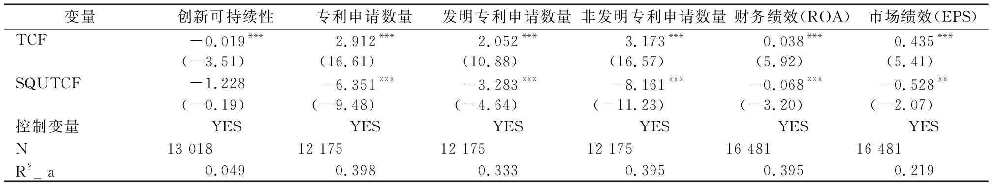 变量创新可持续性专利申请数量发明专利申请数量非发明专利申请数量财务绩效(ROA)市场绩效(EPS)TCF-0.019***2.912***2.052***3.173***0.038***0.435***(-3.51)(16.61)(10.88)(16.57)(5.92)(5.41)SQUTCF-1.228-6.351***-3.283***-8.161***-0.068***-0.528**(-0.19)(-9.48)(-4.64)(-11.23)(-3.20)(-2.07)控制变量YESYESYESYESYESYESN13 01812 17512 17512 17516 48116 481R2_ a0.0490.3980.3330.3950.3950.219