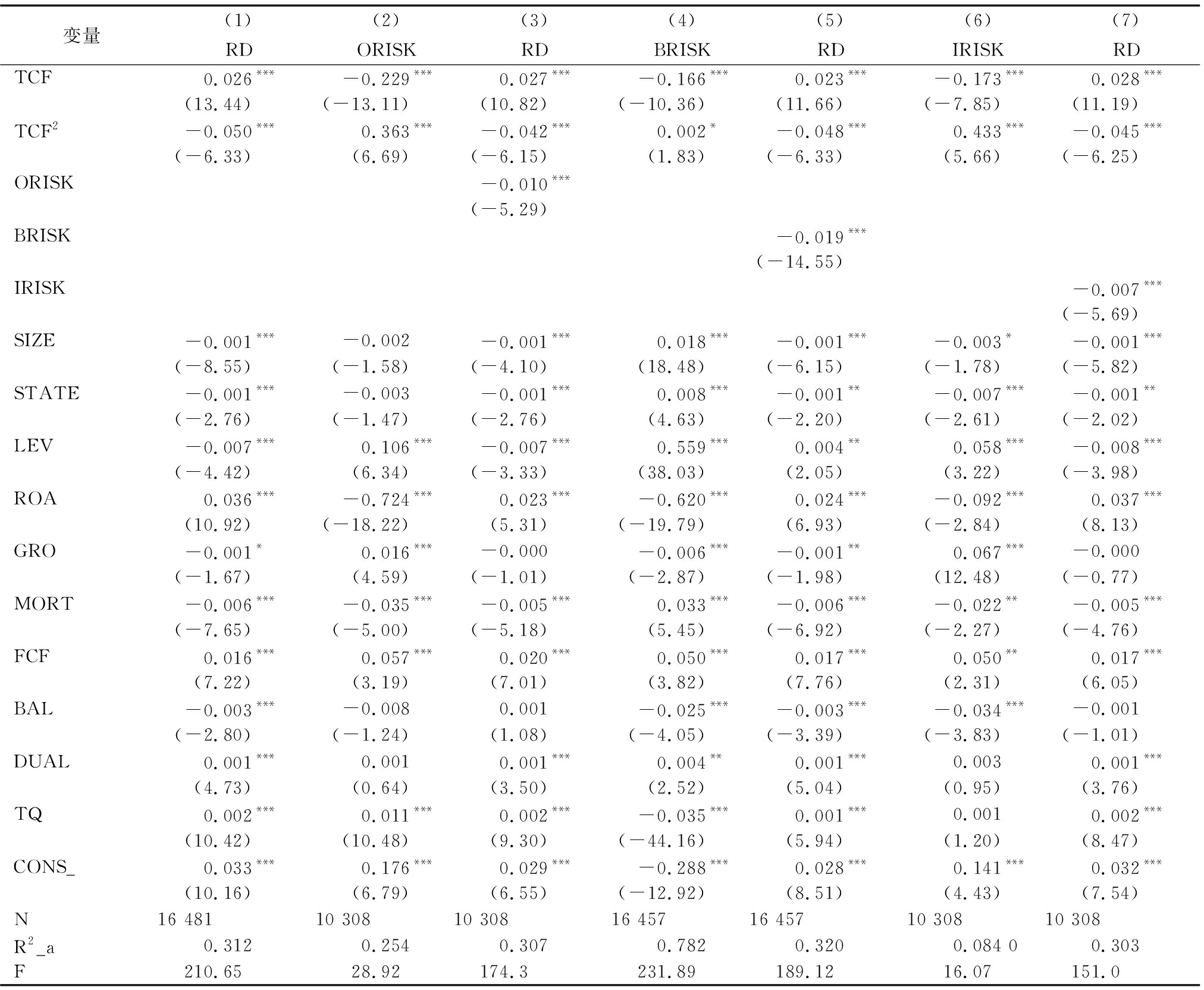 变量(1)(2)(3)(4)(5)(6)(7)RDORISKRDBRISKRDIRISKRDTCF0.040***-0.170***0.043***-0.157***0.037***-0.187***0.049***(14.24)(-8.73)(11.58)(-8.41)(13.18)(-6.31)(13.66)TCF2-0.091***0.770***-0.086***-0.276-0.087***1.013***-0.085***(-3.80)(4.85)(-3.28)(-1.63)(-4.07)(4.61)(-4.15)ORISK-0.011***(-6.00)BRISK-0.019***(-14.58)IRISK-0.007***(-5.83)控制变量YESYESYESYESYESYESYESN16 48110 30810 30816 45716 45710 30810 308R2_a0.3140.2380.3100.7810.3220.081 00.308