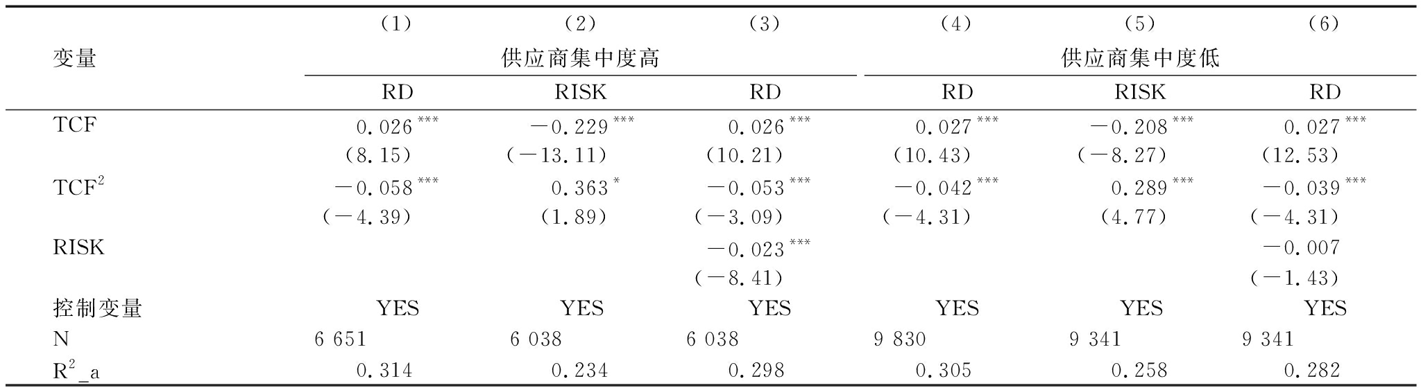 此外,表8列(4)~(6)结果显示,虽然RISK作为中介变量与TCF显著负相关、与TCF2显著正相关,但RD对RISK的回归系数并不显著。Sobel和Boostrap均未通过联合检验,表明在供应商集中度低组,企业风险的中介效应不显著。而在供应商集中度高组,RISK均通过中介效应检验,且中介效应比例达到14.4%,高于全样本(7.26%)和供应商集中度低组(4.81%)。上述结果表明,供应商集中度越高,商业信用融资对研发投资的倒U型影响越大。因此,企业需要加强风险管控,避免过早触及阈值。