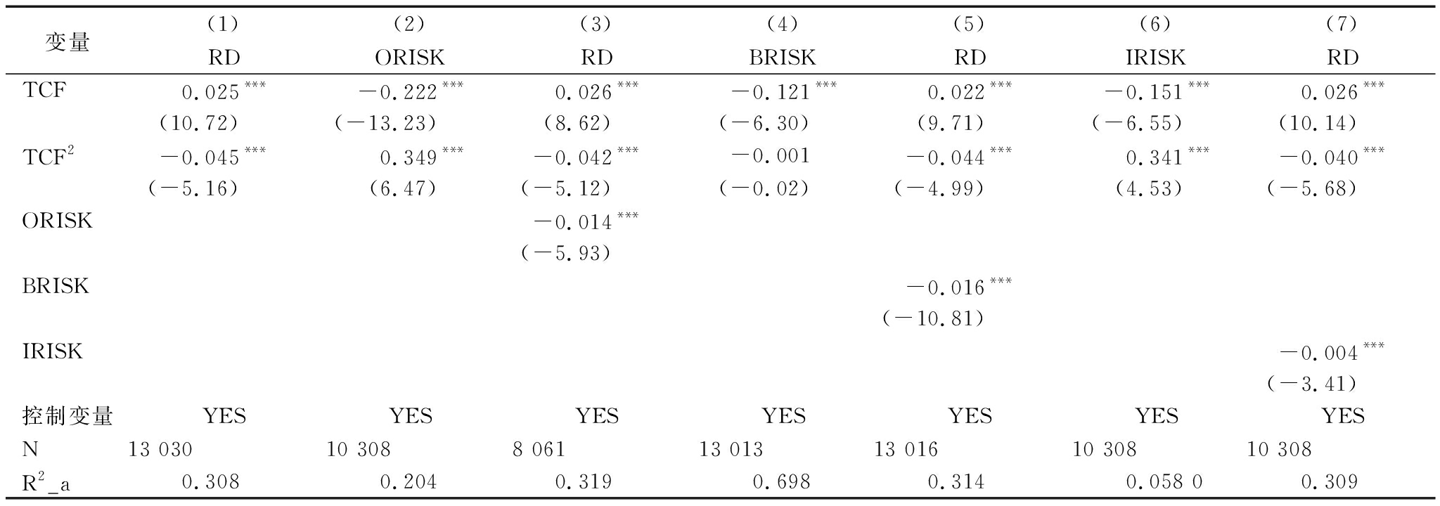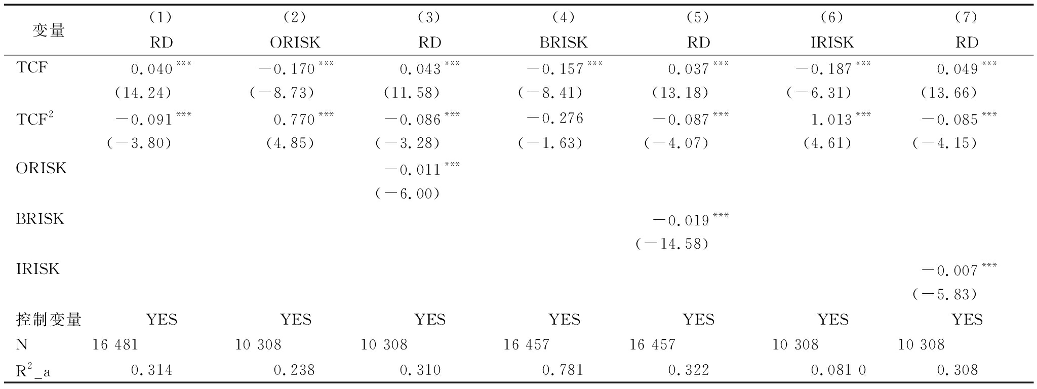 (2)商业信用融资对研发投资的影响机理。表4列(2)~(7)用以检验企业风险在商业信用融资对研发投资的影响中是否存在中介效应。结果显示,在列(2)、(4)、(6)中,TCF系数显著为负(分别为-0.229,-0.166,-0.173),TCF2系数显著为正(分别为0.363,0.002,0.433),说明商业信用融资与企业各类风险存在U型关系,意味着商业信用融资递增会导致企业风险系数先降后升。而ORISK、BRISK和IRISK在RD方程中的回归系数均显著为负,说明企业风险与创新高风险之间互为矛盾,过高的企业风险不利于研发投资的顺利进行。