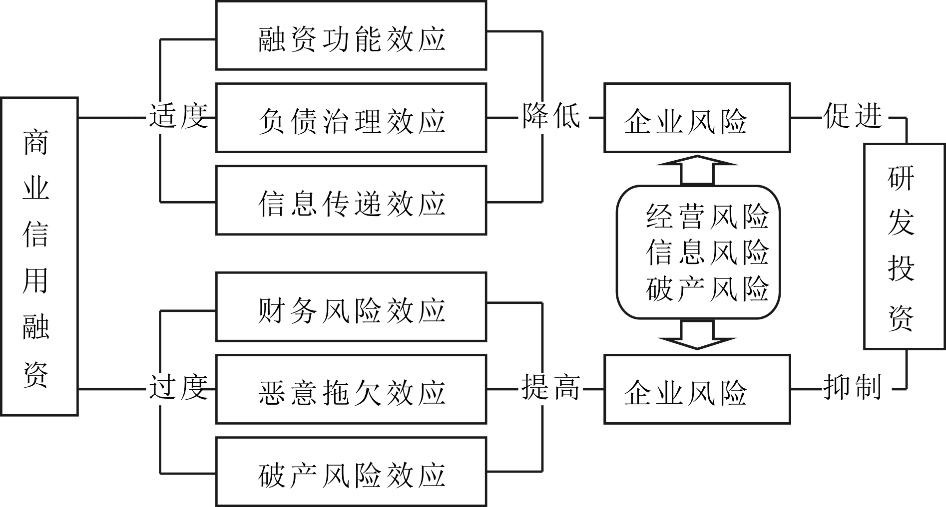 学界关于商业信用融资与研发投资的探讨较少,因为发达资本市场中商业信用的使用是增加资金流动性和缓解融资约束,而并非研发投资的主要来源。由于商业信用成本高昂,其并不是外部融资的首选[24]。但是,在欠发达的中国金融市场中,商业信用融资是银行贷款的重要替代方式,其融资功能效应、信号传递效应、外部治理效应和债务风险效应等势必对研发投资产生深刻影响。国内学者对此进行初步探讨,但大多是基于商业信用的某一效应得出促进论或抑制论。于波和霍永强[23]纳入商业信用融资的双重效应,发现商业信用融资对企业创新的促进作用存在最优解,但未剖析不同阶段商业信用融资究竟发挥何种效应,又是如何影响企业技术创新的。