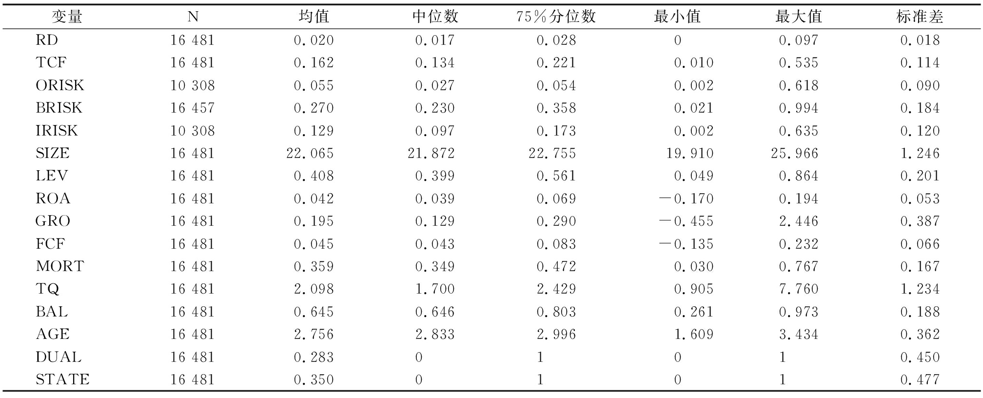变量N均值中位数75%分位数最小值最大值标准差RD16 4810.0200.0170.02800.0970.018TCF16 4810.1620.1340.2210.0100.5350.114ORISK10 3080.0550.0270.0540.0020.6180.090BRISK16 4570.2700.2300.3580.0210.9940.184IRISK10 3080.1290.0970.1730.0020.6350.120SIZE16 48122.06521.87222.75519.91025.9661.246LEV16 4810.4080.3990.5610.0490.8640.201ROA16 4810.0420.0390.069-0.1700.1940.053GRO16 4810.1950.1290.290-0.4552.4460.387FCF16 4810.0450.0430.083-0.1350.2320.066MORT16 4810.3590.3490.4720.0300.7670.167TQ16 4812.0981.7002.4290.9057.7601.234BAL16 4810.6450.6460.8030.2610.9730.188AGE16 4812.7562.8332.9961.6093.4340.362DUAL16 4810.28301010.450STATE16 4810.35001010.477