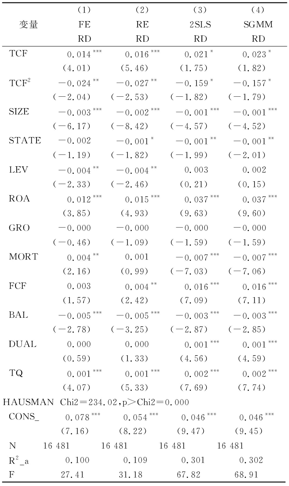 (1)(2)(3)(4)变量FERE2SLSSGMMRDRDRDRDTCF0.014***0.016***0.021*0.023*(4.01)(5.46)(1.75)(1.82)TCF2-0.024**-0.027**-0.159*-0.157*(-2.04)(-2.53)(-1.82)(-1.79)SIZE-0.003***-0.002***-0.001***-0.001***(-6.17)(-8.42)(-4.57)(-4.52)STATE-0.002-0.001*-0.001**-0.001**(-1.19)(-1.82)(-1.99)(-2.01)LEV-0.004**-0.004**0.0030.002(-2.33)(-2.46)(0.21)(0.15)ROA0.012***0.015***0.037***0.037***(3.85)(4.93)(9.63)(9.60)GRO-0.000-0.000-0.000-0.000(-0.46)(-1.09)(-1.59)(-1.59)MORT0.004**0.001-0.007***-0.007***(2.16)(0.99)(-7.03)(-7.06)FCF0.0030.004**0.016***0.016***(1.57)(2.42)(7.09)(7.11)BAL-0.005***-0.005***-0.003***-0.003***(-2.78)(-3.25)(-2.87)(-2.85)DUAL0.0000.0000.001***0.001***(0.59)(1.33)(4.56)(4.59)TQ0.001***0.001***0.002***0.002***(4.07)(5.33)(7.69)(7.74)HAUSMANChi2=234.02,p>Chi2=0.000CONS_0.078***0.054***0.046***0.046***(7.16)(8.22)(9.47)(9.45)N16 48116 48116 48116 481R2_a0.1000.1090.3010.302F27.4131.1867.8268.91