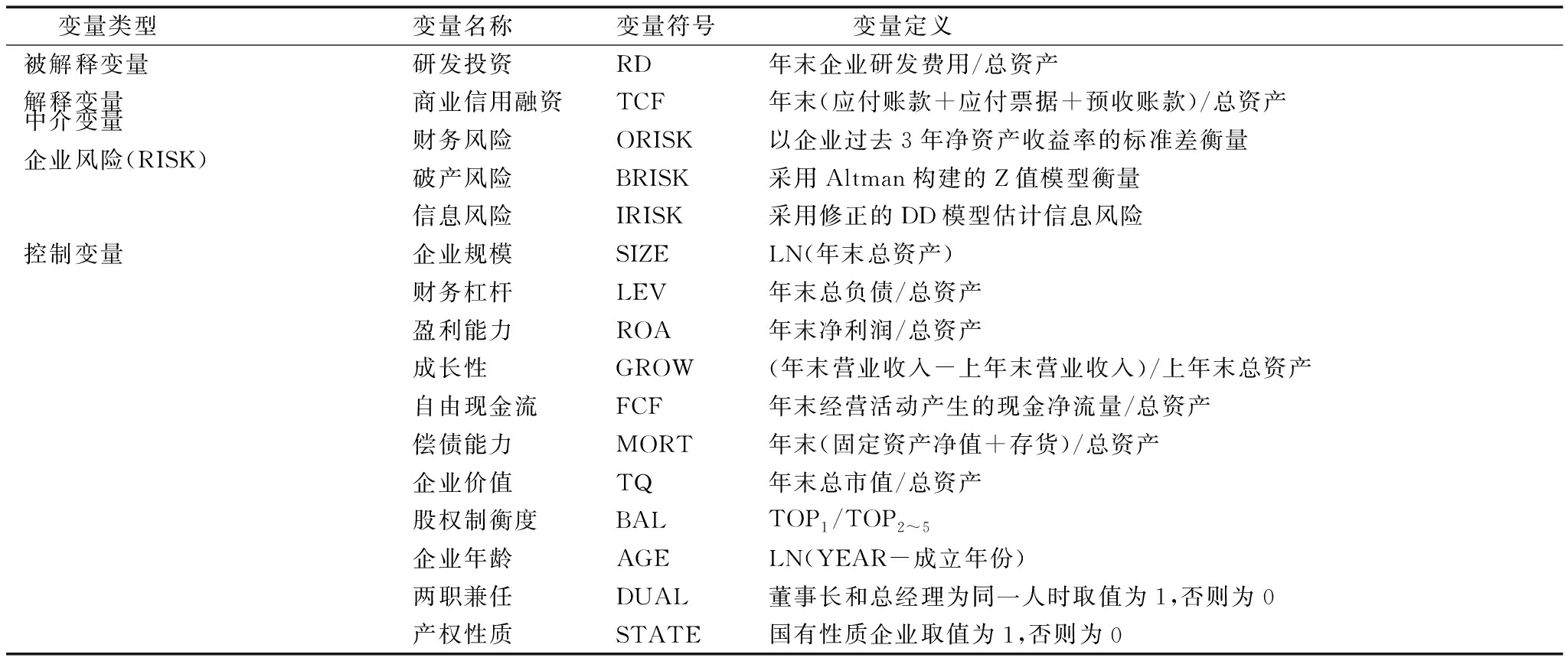 变量类型变量名称变量符号变量定义被解释变量研发投资RD年末企业研发费用/总资产解释变量商业信用融资TCF年末(应付账款+应付票据+预收账款)/总资产中介变量企业风险(RISK)财务风险ORISK以企业过去3年净资产收益率的标准差衡量破产风险BRISK采用Altman构建的Z值模型衡量信息风险IRISK采用修正的DD模型估计信息风险控制变量企业规模SIZELN(年末总资产)财务杠杆LEV年末总负债/总资产盈利能力ROA年末净利润/总资产成长性GROW(年末营业收入-上年末营业收入)/上年末总资产自由现金流FCF年末经营活动产生的现金净流量/总资产偿债能力MORT年末(固定资产净值+存货)/总资产企业价值TQ年末总市值/总资产股权制衡度BALTOP1/TOP2~5企业年龄AGELN(YEAR-成立年份)两职兼任DUAL董事长和总经理为同一人时取值为1,否则为0产权性质STATE国有性质企业取值为1,否则为0