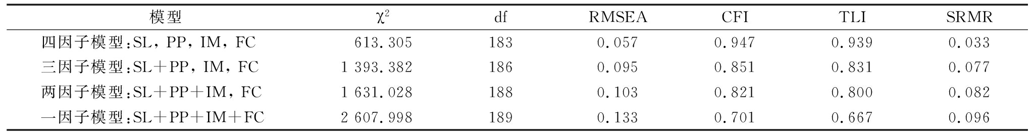 模型χ2dfRMSEACFITLISRMR四因子模型:SL, PP, IM, FC613.3051830.0570.9470.9390.033三因子模型:SL+PP, IM, FC1 393.3821860.0950.8510.8310.077两因子模型:SL+PP+IM, FC1 631.0281880.1030.8210.8000.082一因子模型:SL+PP+IM+FC2 607.9981890.1330.7010.6670.096