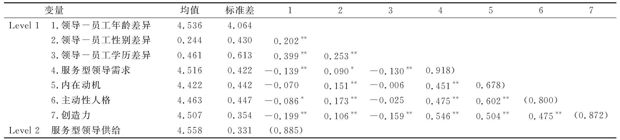变量均值标准差1234567Level 11.领导-员工年龄差异4.5364.0642.领导-员工性别差异0.2440.4300.202**3.领导-员工学历差异0.4610.6130.399**0.253**4.服务型领导需求4.5160.422-0.139**0.090*-0.130**0.918)5.内在动机4.4220.442-0.070 0.151**-0.006 0.451**0.678)6.主动性人格4.4630.447-0.086*0.173**-0.025 0.475**0.602**(0.800)7.创造力4.5070.354-0.199**0.106**-0.159**0.546**0.504**0.475**(0.872)Level 2服务型领导供给4.5580.331(0.885)