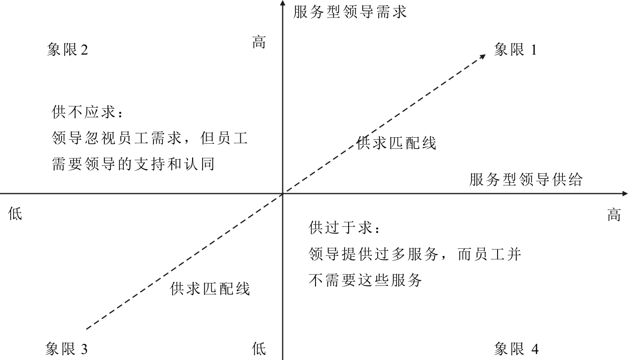 在组织中,服务型领导在追随者需求和供给上存在差异,根据程度差异表现为由低到高的连续轴,形成4个象限如图2所示。象限1和象限3为匹配(congruence),沿着供求匹配线从左下到右上(由象限3到象限1),由低供给-低需求匹配到高供给-高需求匹配,呈现连续变化趋势;象限2和象限4为不匹配(incongruence)情况,象限2描述供不应求(低供给-高需求)的情况,追随者亟需服务型领导满足个体需求以实现发展,但是,领导者并没有提供足够供给和支持(如沟通、接纳、授权);象限4描述供过于求(高供给-低需求)的情况,领导者提供过剩的服务型领导供给,过于关注员工需求,可能出现授权过度、沟通频繁等现象,但追随者对领导者提供的这些服务并无需求和兴趣,因此,服务型领导的高供给-低需求并不能发挥理想的效用,造成领导资源浪费。