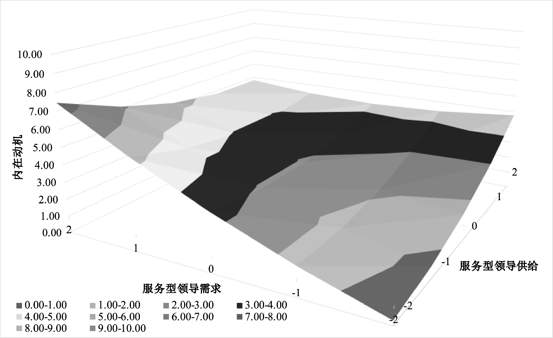 根据表3绘制响应面图,较为形象地解释领导供求匹配一致性对追随者内在动机的影响,以追随者的服务型领导需求为X轴,以服务型领导供给为Y轴,以追随者内在动机为Z轴,拟合得到服务型领导供求与追随者内在动机的三维模型(见图3)。由图3可见,响应面大致呈平面,反映线性关系;后角(高供给-高需求)的追随者内在动机高于前角(低供给-低需求),左角(低供给-高需求)与右角(高供给-低需求)变化趋势沿着不一致线呈U型变化趋势。综上,进一步验证了H1。