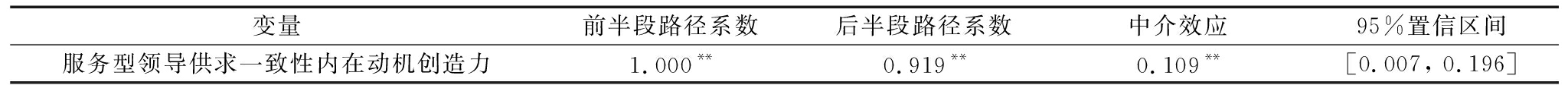 变量前半段路径系数后半段路径系数中介效应95%置信区间服务型领导供求一致性内在动机创造力1.000**0.919**0.109**[0.007, 0.196]