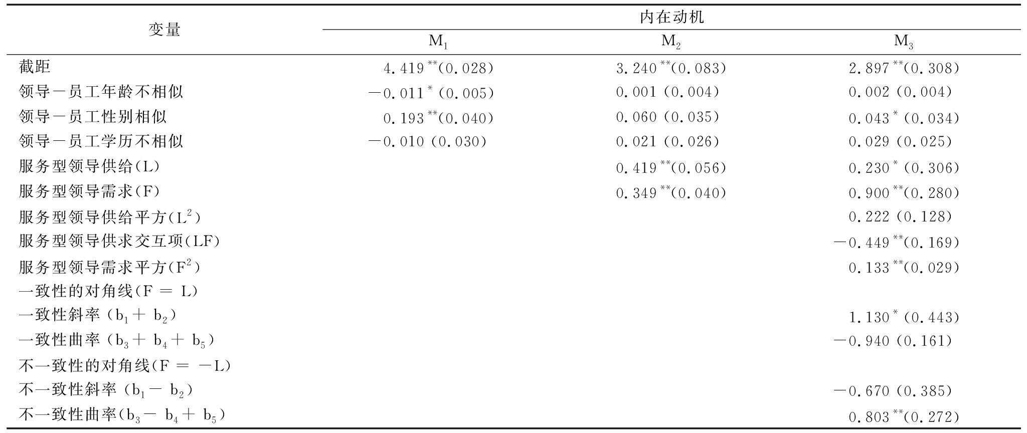 变量内在动机M1M2M3截距4.419** (0.028)3.240** (0.083)2.897** (0.308)领导-员工年龄不相似-0.011* (0.005)0.001 (0.004)0.002 (0.004)领导-员工性别相似0.193** (0.040)0.060 (0.035)0.043* (0.034)领导-员工学历不相似-0.010 (0.030)0.021 (0.026)0.029 (0.025)服务型领导供给(L)0.419** (0.056)0.230* (0.306)服务型领导需求(F)0.349** (0.040)0.900** (0.280)服务型领导供给平方(L2)0.222 (0.128)服务型领导供求交互项(LF)-0.449** (0.169)服务型领导需求平方(F2)0.133** (0.029)一致性的对角线(F = L)一致性斜率 (b1 + b2)1.130* (0.443)一致性曲率 (b3 + b4 + b5)-0.940 (0.161)不一致性的对角线(F = -L)不一致性斜率 (b1 - b2)-0.670 (0.385)不一致性曲率(b3 - b4 + b5)0.803** (0.272)