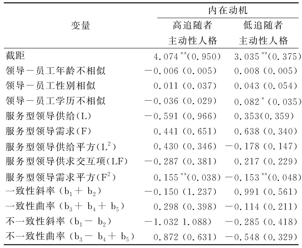 变量内在动机高追随者主动性人格低追随者主动性人格截距 4.074** (0.950) 3.035** (0.375)领导-员工年龄不相似-0.006 (0.005)0.008 (0.005)领导-员工性别相似0.011 (0.037)0.043 (0.054)领导-员工学历不相似-0.036 (0.029)0.082* (0.035)服务型领导供给(L) -0.591 (0.966)0.353(0.359)服务型领导需求(F) 0.441 (0.651)0.638 (0.340)服务型领导供给平方(L2)0.430 (0.346)-0.178 (0.147)服务型领导供求交互项(LF) -0.287 (0.381)0.217 (0.229)服务型领导需求平方(F2)0.155** (0.038)-0.153** (0.048)一致性斜率 (b1 + b2)-0.150 (1.237)0.991 (0.561)一致性曲率 (b3 + b4 + b5)0.298 (0.398)-0.114 (0.211)不一致性斜率 (b1 - b2)-1.032 1.088)-0.285 (0.418)不一致性曲率 (b3 - b4 + b5)0.872 (0.631)-0.548 (0.329)