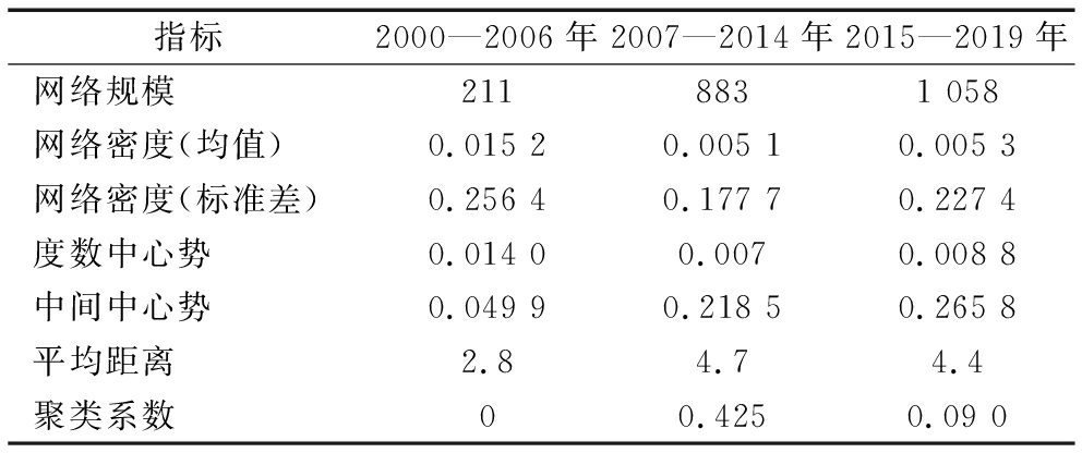 指标2000—2006年2007—2014年2015—2019年网络规模2118831 058网络密度(均值)0.015 20.005 10.005 3网络密度(标准差)0.256 40.177 70.227 4度数中心势0.014 00.0070.008 8中间中心势0.049 90.218 50.265 8平均距离2.84.74.4聚类系数00.4250.09 0