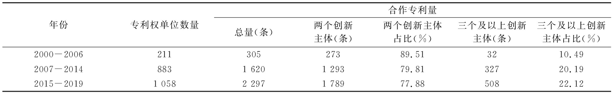 年份专利权单位数量合作专利量总量(条)两个创新主体(条)两个创新主体占比(%)三个及以上创新主体(条)三个及以上创新主体占比(%)2000-200621130527389.513210.492007-20148831 6201 29379.8132720.192015-20191 0582 2971 78977.8850822.12