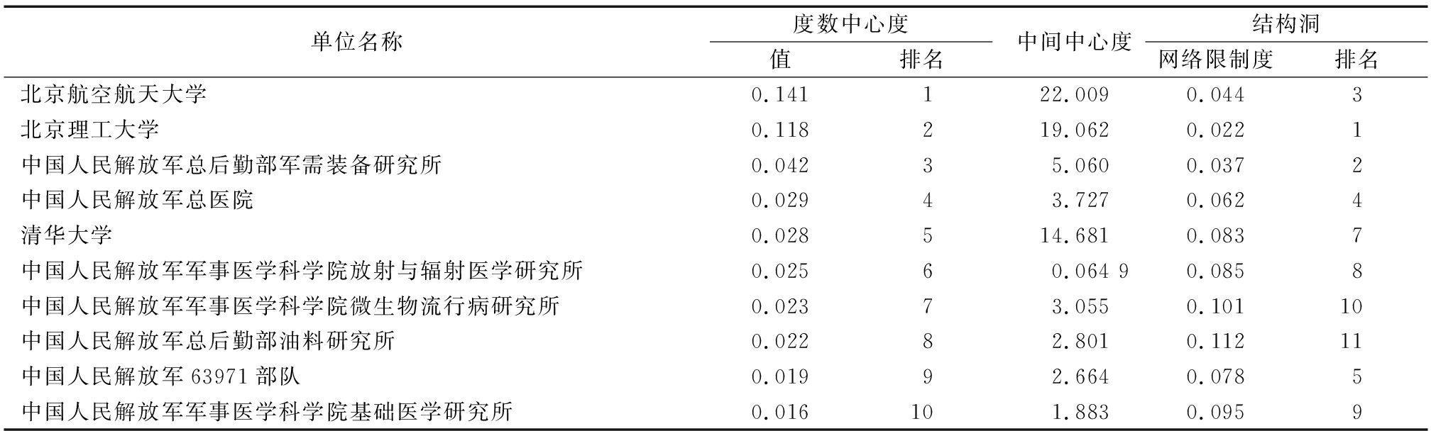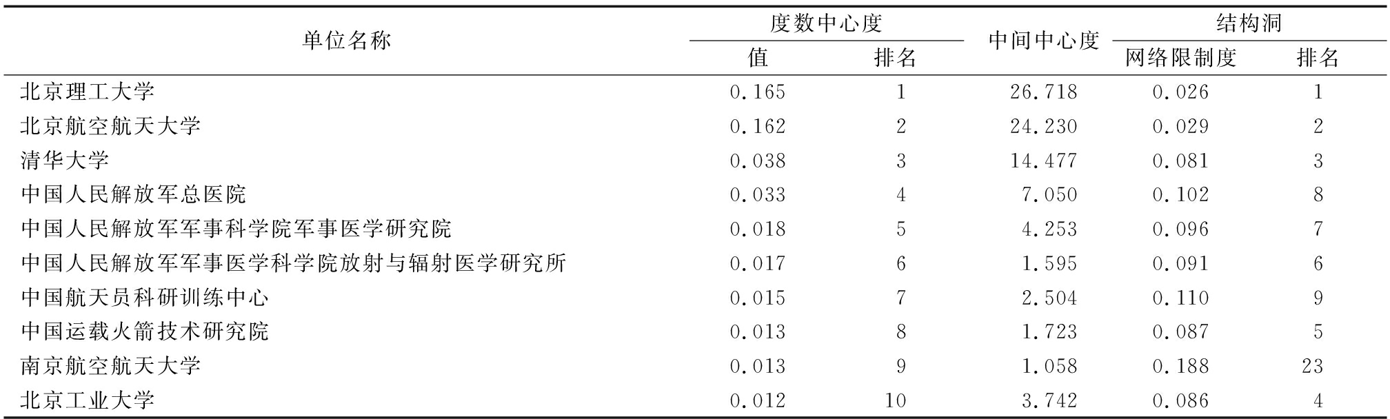 单位名称度数中心度值排名中间中心度结构洞网络限制度排名北京理工大学0.165126.7180.0261北京航空航天大学0.162224.2300.0292清华大学0.038314.4770.0813中国人民解放军总医院0.03347.0500.1028中国人民解放军军事科学院军事医学研究院0.01854.2530.0967中国人民解放军军事医学科学院放射与辐射医学研究所0.01761.5950.0916中国航天员科研训练中心0.01572.5040.1109中国运载火箭技术研究院0.01381.7230.0875南京航空航天大学0.01391.0580.18823北京工业大学0.012103.7420.0864