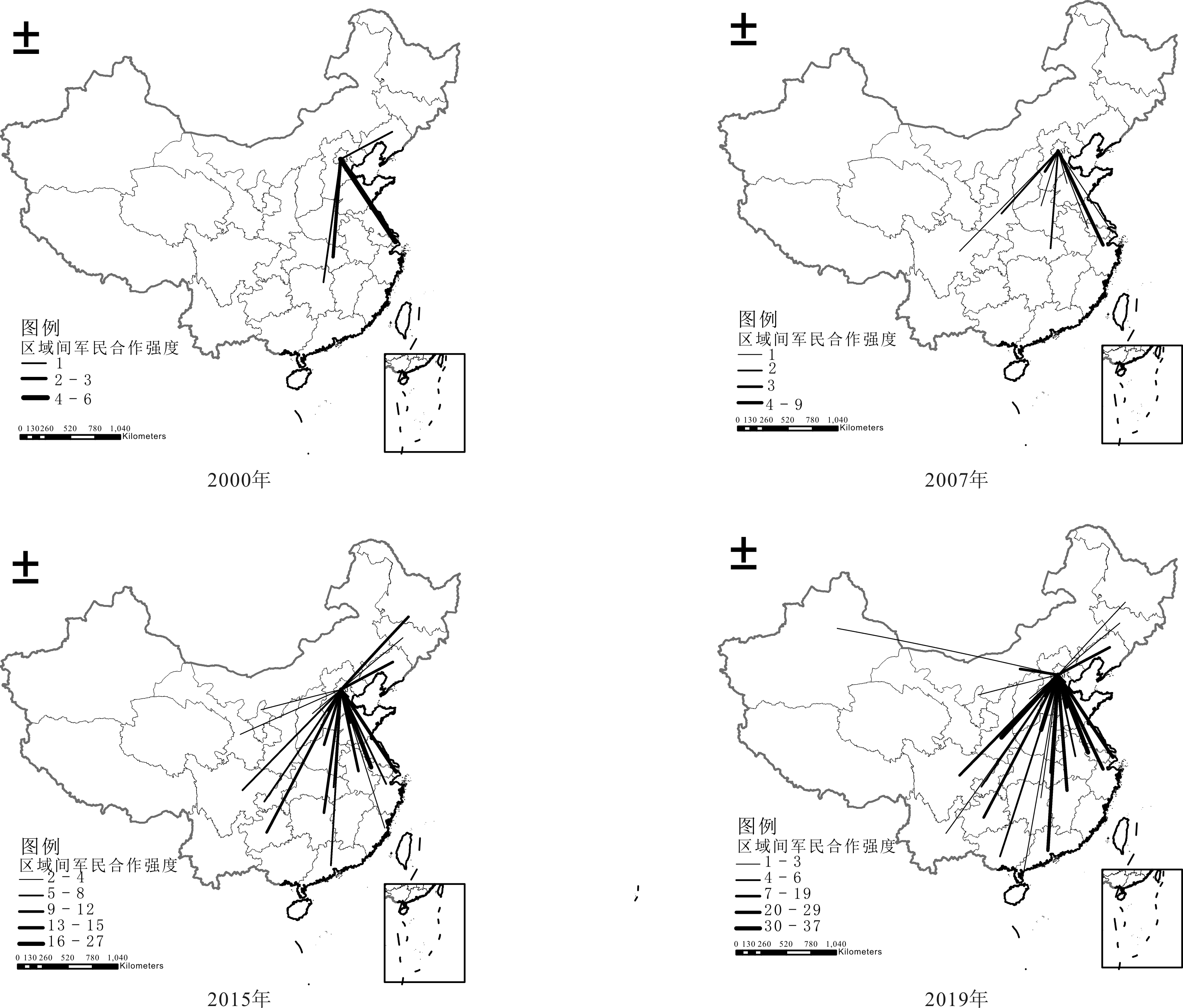 为分析军民科技协同创新网络区域合作演化过程,运用ArcGIS软件绘制空间分布图,输入节点空间属性和军民两类创新主体参与跨区域合作次数,得到网络空间关系强度,如图5所示。其中,连线粗细代表区域间军民合作次数,连线越粗代表区域间军民合作次数越多。由图5可知,随着时间推移,跨区域军民合作强度不断增加,军民合作区域不断扩大。尽管地理距离增加会大大提高合作成本,但随着我国交通和信息技术的迅速发展,北京跨区域军民专利合作网络规模不断扩大,说明地理距离限制性逐渐减弱。具体而言:2000年军民创新主体间跨区域合作交流次数较少,北京只与湖南、湖北、上海、辽宁开展过少数几次军合作交流;2007年军民跨区域合作交流次数明显增加,合作区域从4个增加到9个,其中北京与浙江开展军民创新跨区域合作程度最深;2015年,军民创新主体开展跨区域合作次数显著增加,且集中于华东地区与中南地区,形成北京为核心、以江苏和上海为次要核心的军民合作空间布局;2019年,军民跨区域合作逐渐走向成熟,地理距离跨度更大,且在军民合作交流层面形成北京—陕西、北京—江苏、北京—河南等多条主要创新合作网络通道,西安、南京和郑州等城市也成为北京乃至全国装备制造业重要知识溢出地区。