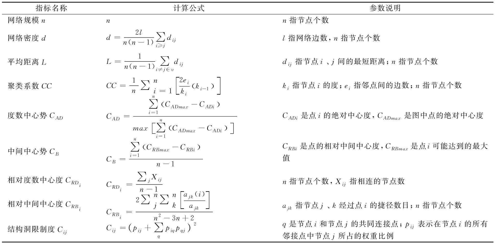 表1 社会网络指标公式及参数说明