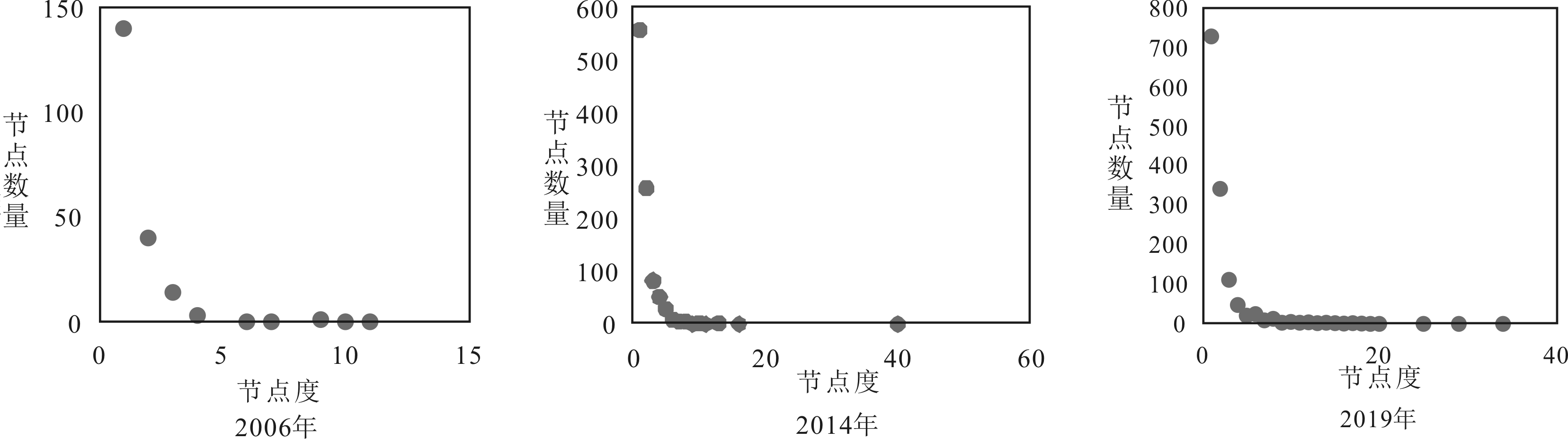网络无标度性表现为较高的异质性,且节点度分布不均匀。基于网络节点增长性和优先连接机制的共同作用,逐渐形成网络无标度特性。从网络整体看,节点数从211个增长到1 058个,网络规模迅速扩大,一直处于动态增长演化状态。与单个节点度进行比较可以看出,网络中大量节点拥有少量连接,而少量节点占据网络中大部分连接,且新加入节点更愿意与高节点度、军民合作紧密和频繁的节点连接,由此出现两极分化现象,如图6所示。根据不同阶段节点度分布图可以发现,3个阶段合作网络无标度特性越来越明显,网络节点度呈现明显的幂律分布特征,少数创新主体在军民合作创新网络中的地位越来越高,符合无标度网络特性,也从侧面展示了军民科技创新合作网络演化方向。
