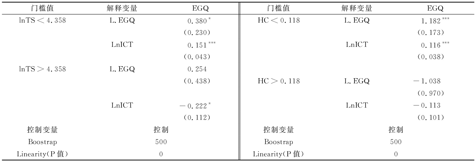 门槛值解释变量EGQ门槛值解释变量EGQlnTS<4.358L.EGQ0.380*HC<0.118L.EGQ1.182***(0.230)(0.173)LnICT0.151***LnICT0.116***(0.043)(0.038)lnTS>4.358L.EGQ0.254(0.438)HC>0.118L.EGQ-1.038(0.970)LnICT-0.222*LnICT-0.113(0.112)(0.101)控制变量控制控制变量控制Boostrap500Boostrap500Linearity(P值)0Linearity(P值)0