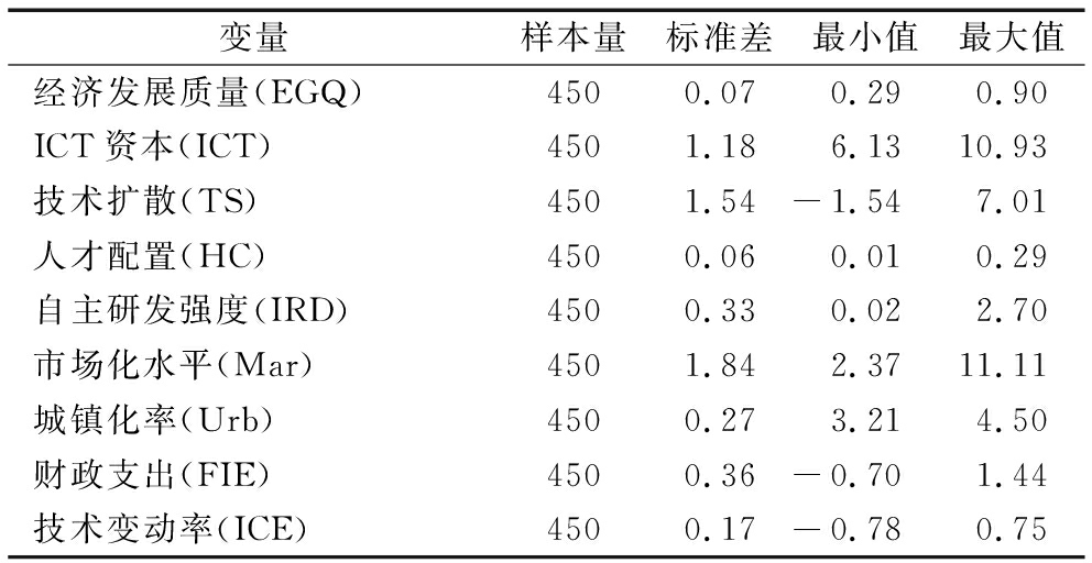 变量样本量标准差最小值最大值经济发展质量(EGQ)4500.070.290.90ICT资本(ICT)4501.186.1310.93技术扩散(TS)4501.54-1.547.01人才配置(HC)4500.060.010.29自主研发强度(IRD)4500.330.022.70市场化水平(Mar)4501.842.3711.11城镇化率(Urb)4500.273.214.50财政支出(FIE)4500.36-0.701.44技术变动率(ICE)4500.17-0.780.75