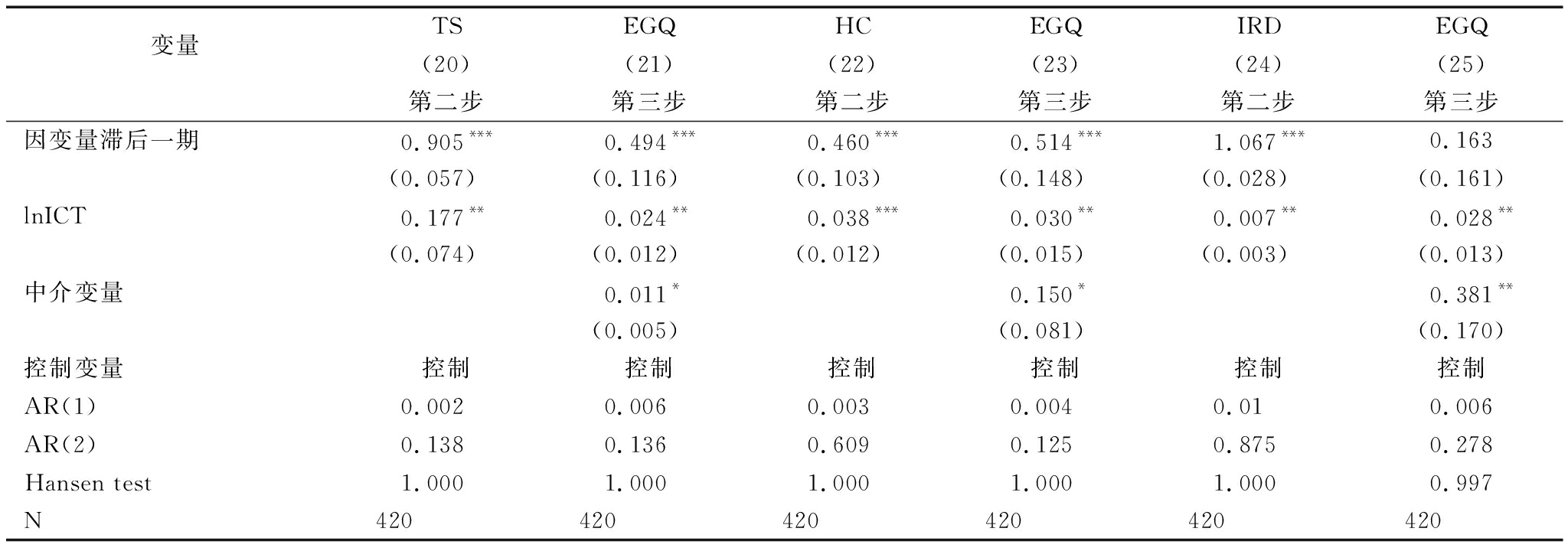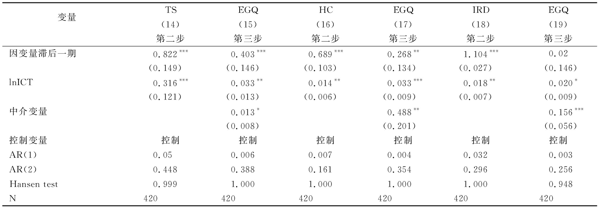 变量TSEGQHCEGQIRDEGQ(7)(8)(9)(10)(11)(12)第二步第三步第二步第三步第二步第三步因变量滞后一期0.747***0.346***0.542***0.609***1.096***0.178(0.204)(0.037)(0.119)(0.147)(0.023)(0.154)lnICT0.426**0.019**0.216***0.017**0.022***0.033**(0.216)(0.008)(0.007)(0.008)(0.007)(0.014)中介变量0.025***0.411**0.134*(0.005)(0.160)(0.072)L1.Mar0.0100.011***-0.010***0.025***-0.004**0.007**(0.037)(0.001)(0.002)(0.006)(0.002)(0.003)L1.lnUrb0.0270.028***-0.018**0.064**-0.021***0.024(0.171)(0.010)(0.008)(0.026)(0.006)(0.024)L1.lnFIE-0.579*0.084***-0.029**0.034-0.048**0.019(0.312)(0.013)(0.014)(0.035)(0.021)(0.049)L1.lnICE-0.099-0.101***0.005-0.0590.023*-0.098**(0.278)(0.010)(0.013)(0.046)(0.013)(0.041)常数项-1.449**-0.0630.060-0.350**0.0280.032(0.703)(0.056)(0.045)(0.145)(0.044)(0.184)AR(1)0.0030.0030.0100.0070.0110.004AR(2)0.1960.1960.1400.4780.3090.287Hansen test1.0001.0001.0001.0001.0000.997N420420420420420420