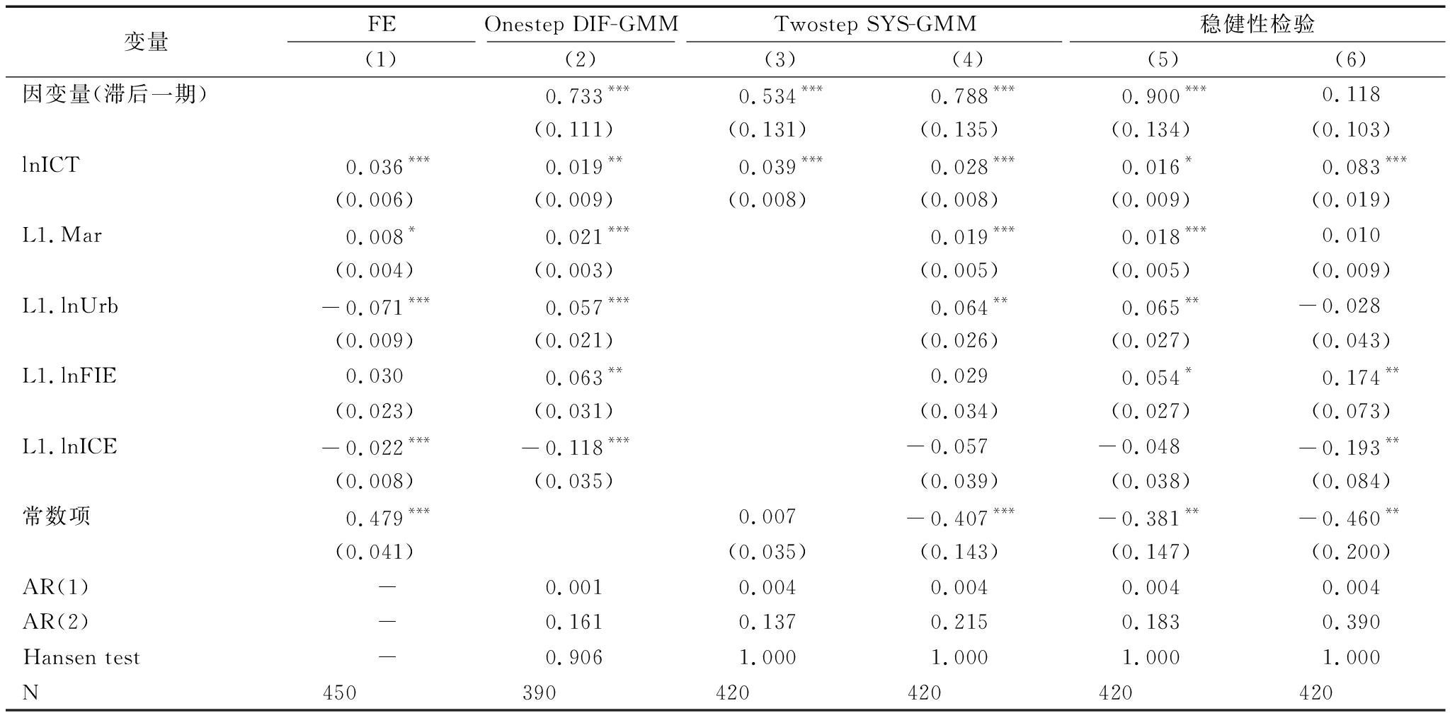 变量FE(1)Onestep DIF-GMM(2)Twostep SYS-GMM(3)(4)稳健性检验(5)(6)因变量(滞后一期)0.733***0.534***0.788***0.900***0.118(0.111)(0.131)(0.135)(0.134)(0.103)lnICT0.036***0.019**0.039***0.028***0.016*0.083***(0.006)(0.009)(0.008)(0.008)(0.009)(0.019)L1.Mar0.008*0.021***0.019***0.018***0.010(0.004)(0.003)(0.005)(0.005)(0.009)L1.lnUrb-0.071***0.057***0.064**0.065**-0.028(0.009)(0.021)(0.026)(0.027)(0.043)L1.lnFIE0.0300.063**0.0290.054*0.174**(0.023)(0.031)(0.034)(0.027)(0.073)L1.lnICE-0.022***-0.118***-0.057-0.048-0.193**(0.008)(0.035)(0.039)(0.038)(0.084)常数项0.479***0.007-0.407***-0.381**-0.460**(0.041)(0.035)(0.143)(0.147)(0.200)AR(1)-0.0010.0040.0040.0040.004AR(2)-0.1610.1370.2150.1830.390Hansen test-0.9061.0001.0001.0001.000N450390420420420420