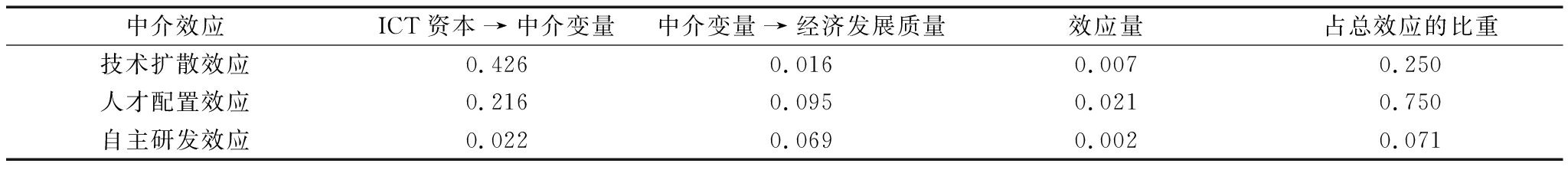 (4)总体中介效应与贡献度分解。表5为加入全部中介变量后的总体中介效应检验结果。与逐步回归法得出的结论比较一致,ICT资本通过技术扩散效应、人才配置效应和自主研发效应3种作用机制显著影响经济发展质量。此外,在加入全部中介变量后,ICT资本对经济发展质量的影响不显著,表明技术扩散效应、人才配置效应和自主研发效应在两者关系中起完全中介作用。ICT资本经由技术扩散效应、人才配置效应、自主研发效应影响经济发展质量的中介效应系数分别为0.007、0.021和0.002,结果如表6所示。从传导机制相对重要程度看,在ICT资本影响经济发展质量的总效应中,有75%是通过人才配置效应间接发挥作用的,技术扩散效应的相对贡献份额为25%,自主研发效应在样本区间内解释ICT资本与经济发展质量因果链条中的7.1%。上述研究结果表明,技术扩散效应、人才配置效应和自主研发效应是ICT资本影响经济发展质量的重要渠道,人才配置效应在ICT资本影响经济发展质量的动态过程中起主导作用。