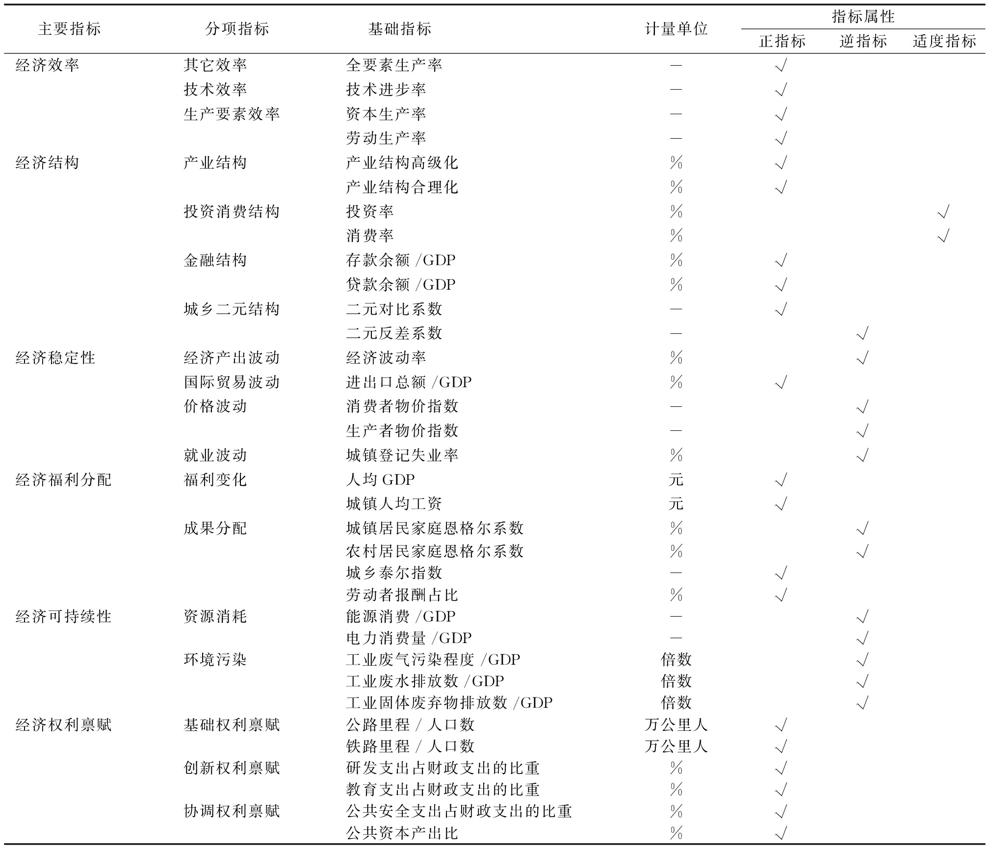 主要指标分项指标基础指标计量单位指标属性正指标逆指标适度指标经济效率其它效率全要素生产率-√技术效率技术进步率-√生产要素效率资本生产率-√劳动生产率-√经济结构产业结构产业结构高级化%√产业结构合理化%√投资消费结构投资率%√消费率%√金融结构存款余额/GDP%√贷款余额/GDP%√城乡二元结构二元对比系数-√二元反差系数-√经济稳定性经济产出波动经济波动率%√国际贸易波动进出口总额/GDP%√价格波动消费者物价指数-√生产者物价指数-√就业波动城镇登记失业率%√经济福利分配福利变化人均GDP元√城镇人均工资元√成果分配城镇居民家庭恩格尔系数%√农村居民家庭恩格尔系数%√城乡泰尔指数-√劳动者报酬占比%√经济可持续性资源消耗能源消费/GDP-√电力消费量/GDP-√环境污染工业废气污染程度/GDP倍数√工业废水排放数/GDP倍数√工业固体废弃物排放数/GDP倍数√经济权利禀赋基础权利禀赋公路里程/人口数万公里人√铁路里程/人口数万公里人√创新权利禀赋研发支出占财政支出的比重%√教育支出占财政支出的比重%√协调权利禀赋公共安全支出占财政支出的比重%√公共资本产出比%√