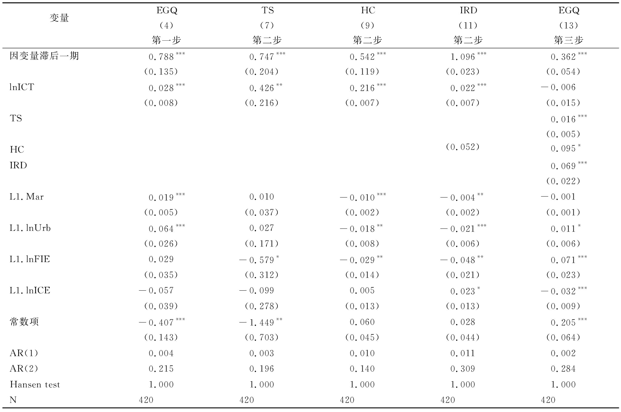 变量EGQTSHCIRDEGQ(4)(7)(9)(11)(13)第一步第二步第二步第二步第三步因变量滞后一期0.788***0.747***0.542***1.096***0.362***(0.135)(0.204)(0.119)(0.023)(0.054)lnICT0.028***0.426**0.216***0.022***-0.006(0.008)(0.216)(0.007)(0.007)(0.015)TS0.016***(0.005)HC0.095*(0.052)IRD0.069***(0.022)L1.Mar0.019***0.010-0.010***-0.004**-0.001(0.005)(0.037)(0.002)(0.002)(0.001)L1.lnUrb0.064***0.027-0.018**-0.021***0.011*(0.026)(0.171)(0.008)(0.006)(0.006)L1.lnFIE0.029-0.579*-0.029**-0.048**0.071***(0.035)(0.312)(0.014)(0.021)(0.023)L1.lnICE-0.057-0.0990.0050.023*-0.032***(0.039)(0.278)(0.013)(0.013)(0.009)常数项-0.407***-1.449**0.0600.0280.205***(0.143)(0.703)(0.045)(0.044)(0.064)AR(1)0.0040.0030.0100.0110.002AR(2)0.2150.1960.1400.3090.284Hansen test1.0001.0001.0001.0001.000N420420420420420