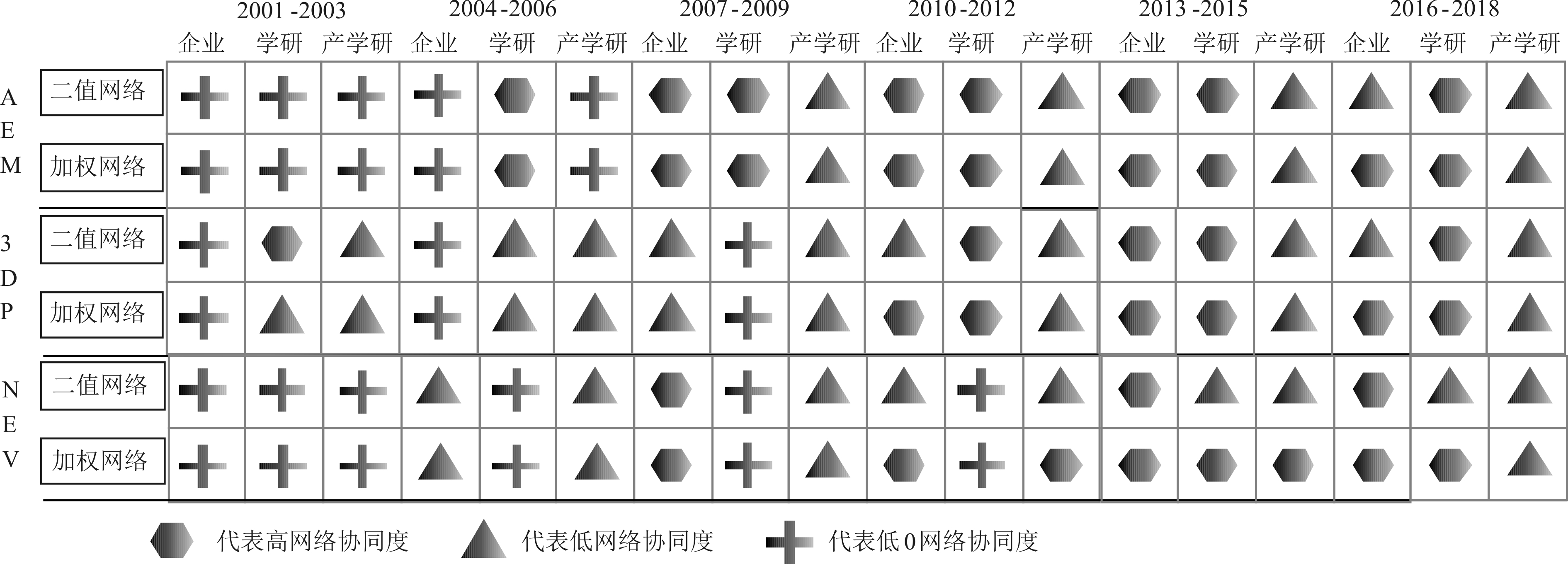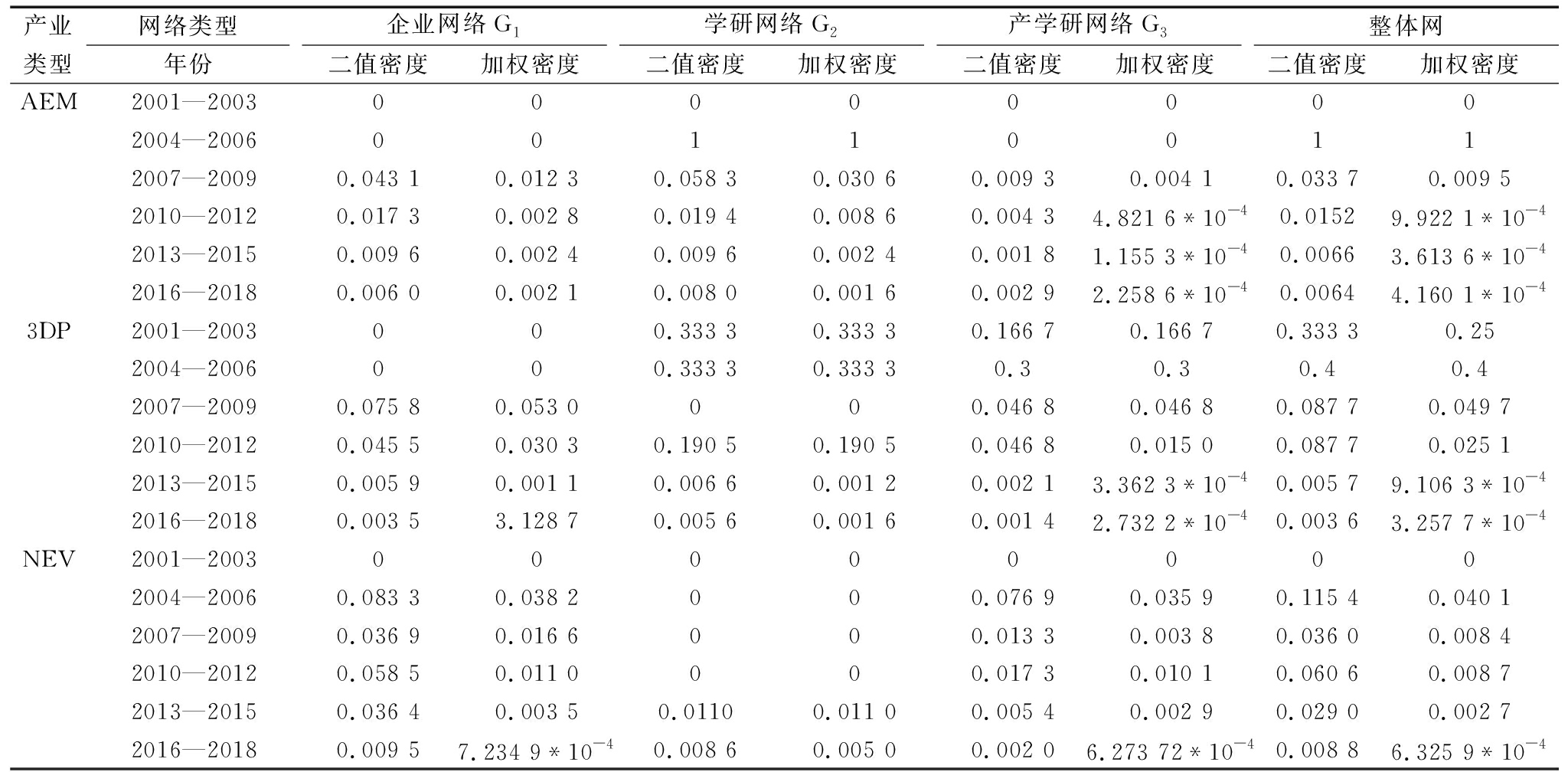 (3)产学研协同创新网络层面。2001—2003年,无论基于二值网络还是加权网络,AEM和NEV产业的产学研协同创新均处于0网络协同度状态,3DP产业呈现低协同度。2004—2009年,3DP和NEV产业均处于低协同度,而AEM产业则经历了2004—2006年0协同度、2007—2009年低协同度的递增变化。2010—2018年,AEM、3DP产业及基于二值网络的NEV产业均处于低协同度状态,而基于加权网络的NEV产业则经历了2010—2015年高协同度、2016—2018年低协同度的递减变化。