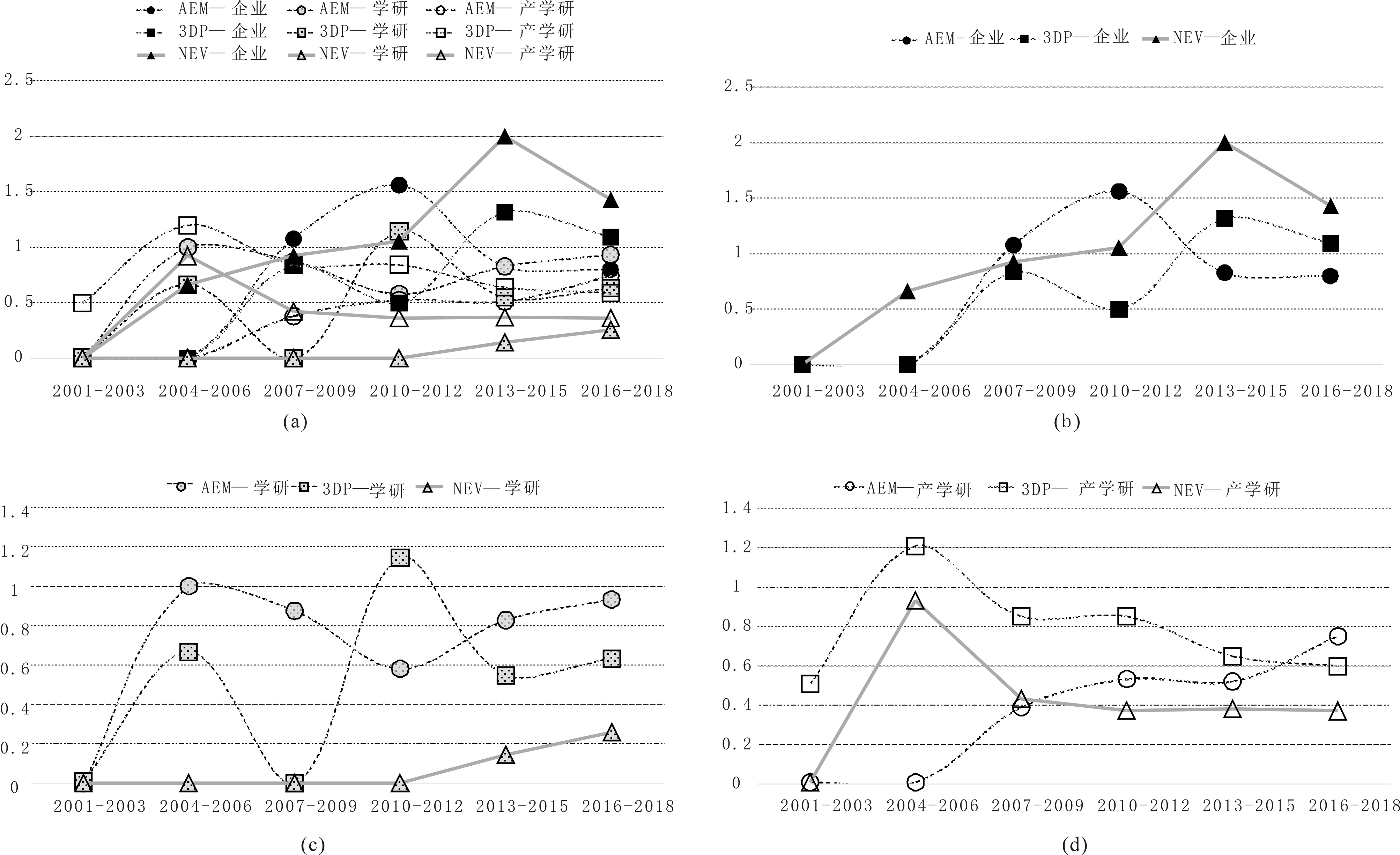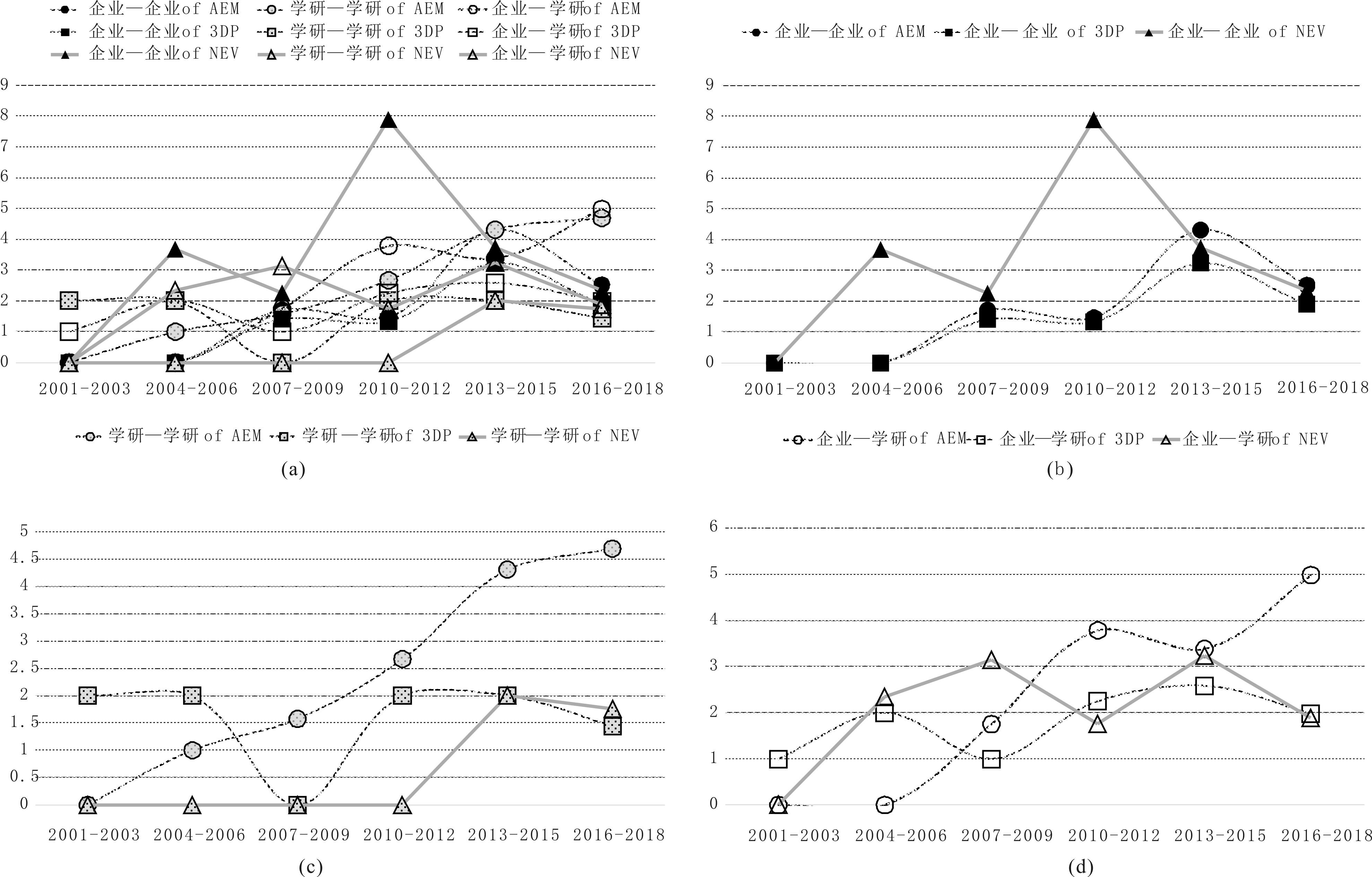 观察图3(b)发现,企业—企业of AEM、企业—企业of 3DP、企业—企业of NEV的联结强度呈波动式变化且均大于1,即合作次数大于1。由前文分析可知,2010—2018年AEM、3DP和NEV产业的企业协同创新网络都具有高协同度。不难发现,高联结强度(大于1)与高网络协同度具有正相关关系,联结强度适度下降并未影响高协同度。因此,高联结强度是保障企业协同创新网络高协同度的重要条件。观察图3(c)发现,学研—学研of AEM、学研—学研of 3DP、学研—学研of NEV的联结强度与企业—企业的变化规律相似,同样呈波动式变化且均大于1。结合前文分析可知,高联结强度(大于1)与学研协同创新网络高协同度具有正相关关系,高联结强度也是保障学研协同创新网络高协同度的重要条件。观察图3(d)发现,企业—学研of AEM、企业—学研of 3DP、企业—学研of NEV的联结强度也具有上述相似变化规律,且均大于1。由前文分析可知,2010—2018年,AEM、3DP产业均处于低协同度,NEV产业则经历了2010—2015年高协同度、2016—2018年低协同度的递减变化。因此,对于产学研协同创新网络而言,即使企业—学研关系的联结强度大于1,仍不能保障高网络协同度。这是因为,企业与学研机构间协同创新过程中,一定联结强度(合作次数)可降低跨界交易成本,如通过联合培养研究生等路径共同申请发明专利,而这些专利并不是产学研协同创新的核心成果。根据社会资本理论,随着企业与学研间合作的深入,二者互惠频率增加,社会资本积累增多,网络必然愈发协同。可见,理论上,高联结强度与网络协同度具有相关关系,但需其它因素与高联结强度(大于1)组合共同影响网络高协同度。